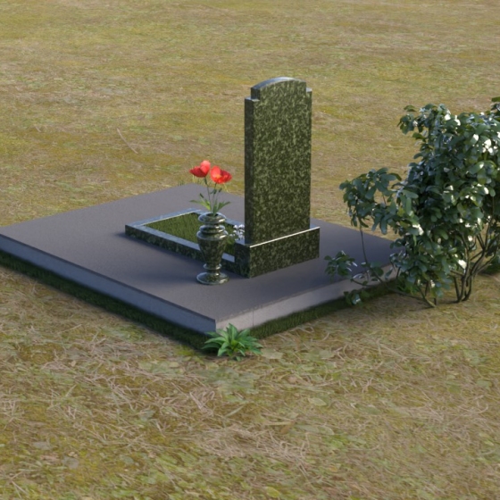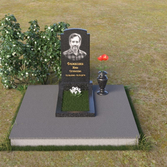 Основной акцент в этой модели сделан на контрасте фактур. Зеркальная полировка черного гранита Габбро-диабаз, из которого выполнена стела, создает эффект бесконечности, отражая небо и окружающий мир. На этом фоне особенно выразительно смотрится гравировка портрета и надписи, выполненные с ювелирной точностью. Нижняя часть стелы, переходящая в горизонтальную плиту, также выполнена из черного гранита, но уже с матовой обработкой, что придает композиции дополнительную глубину и текстуру. Рядом располагается ваза из того же гранита, выполненная в классическом стиле, предназначенная для живых цветов, которые станут символом памяти и любви.