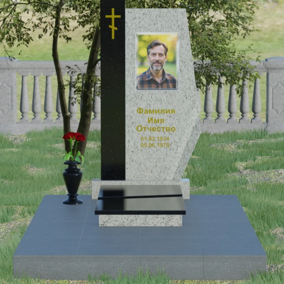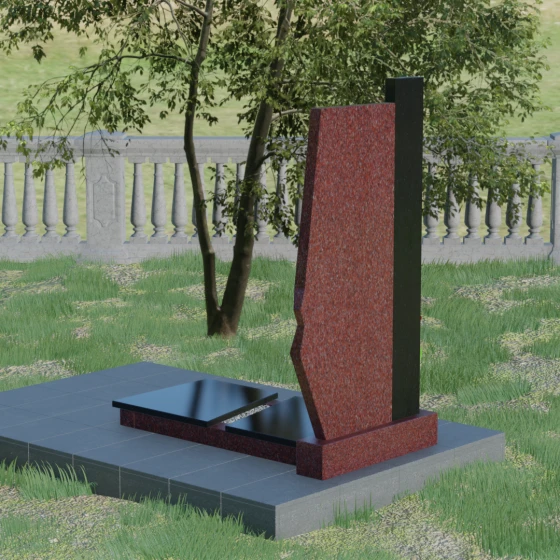 Данная мемориальная композиция — это торжество современной архитектурной мысли, воплощенное в благородном граните. Выбор этой модели обусловлен её уникальной асимметричной геометрией, которая выделяет захоронение на фоне типовых решений. Комбинированное исполнение из двух контрастных видов камня позволяет создать глубокий визуальный акцент: вертикальная колонна из насыщенного красного гранита символизирует духовную опору и жизненную энергию, в то время как основная стела из глубокого черного камня олицетворяет вечный покой и скорбь. Надгробие из натурального камня такой формы выглядит монументально и одновременно изящно благодаря сложной огранке. Правая грань основной стелы дополнена характерным скосом и ступенчатым вырезом, что придает изделию динамику и многогранность. Особое внимание уделено игре света и тени на полированных поверхностях: зеркальный блеск черного гранита отражает небо, создавая эффект глубины, а матовые фаски подчеркивают строгость и чистоту линий архитектурного ансамбля.