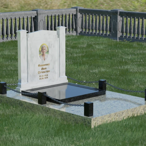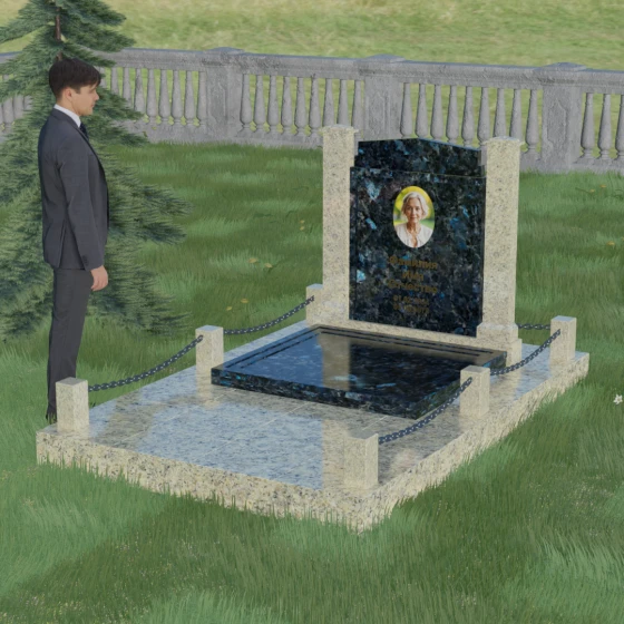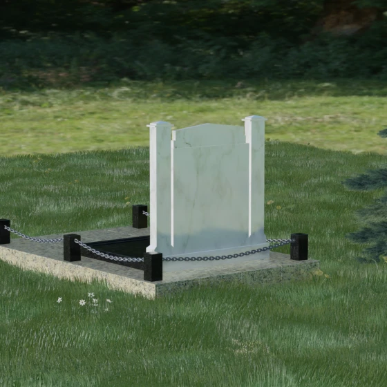 Особого внимания заслуживает полное благоустройство участка, входящее в концепцию модели 011. Памятник устанавливается на массивный гранитный цоколь, который придает всей конструкции устойчивость и защищает её от сезонных подвижек грунта. Вместо открытого цветника здесь используется сплошная надгробная плита, закрывающая всю площадь захоронения. Это создает эстетически законченный, строгий вид и значительно упрощает уход за могилой — вам не придется бороться с сорняками или обновлять засыпку. Завершают композицию аккуратные каменные столбики с декоративными цепями, которые обозначают границы частного пространства, создавая атмосферу уединения и покоя.