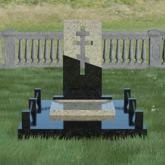 Данная модель — это торжество современной архитектуры и глубокого сакрального смысла. В центре композиции находится величественная стела, состоящая из двух контрастных блоков, разделенных динамичной диагональной линией. Этот художественный прием символизирует границу между земным и вечным, светом и тенью. Главной особенностью изделия является филигранная сквозная резьба: в самом сердце камня вырезан православный восьмиконечный крест. Лаконичность форм подчеркивает строгость и достоинство, а отсутствие лишнего декора позволяет сфокусироваться на главном символе веры.