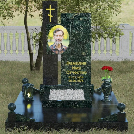 Данное ритуальное изделие представляет собой подлинный образец современного мемориального искусства, в котором строгость архитектурных форм гармонично сочетается с глубоким философским подтекстом. Композиция выстроена на изящном сопоставлении двух вертикальных стел, имеющих разную высоту и фактуру. Асимметричное исполнение символизирует многогранность человеческой жизни: её взлеты и земное завершение. Высокая зеркально-черная стела воплощает собой бесконечность космоса и тишину вечного сна, в то время как примыкающий к ней цветной элемент из благородного камня привносит в ансамбль теплоту земных воспоминаний. Плавные переходы между гранями и безупречная полировка создают ощущение текучести времени, которое застыло в камне, оберегая вечный покой усопшего.