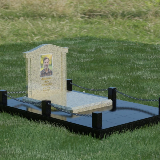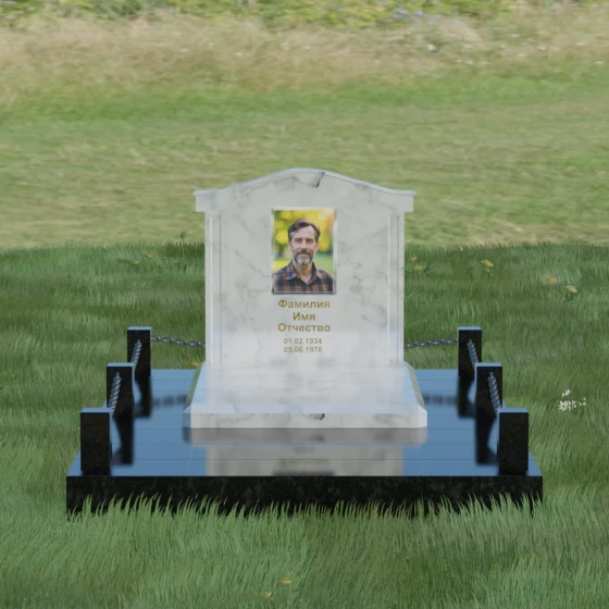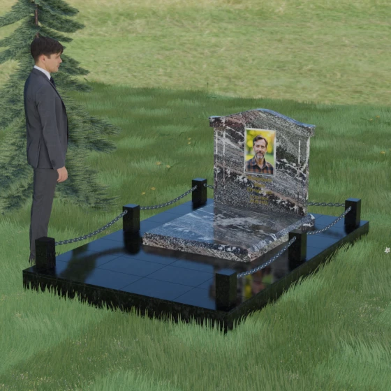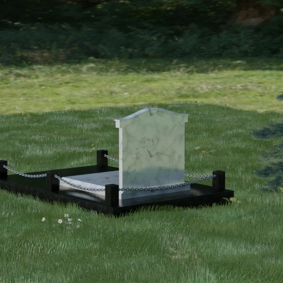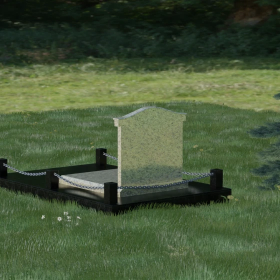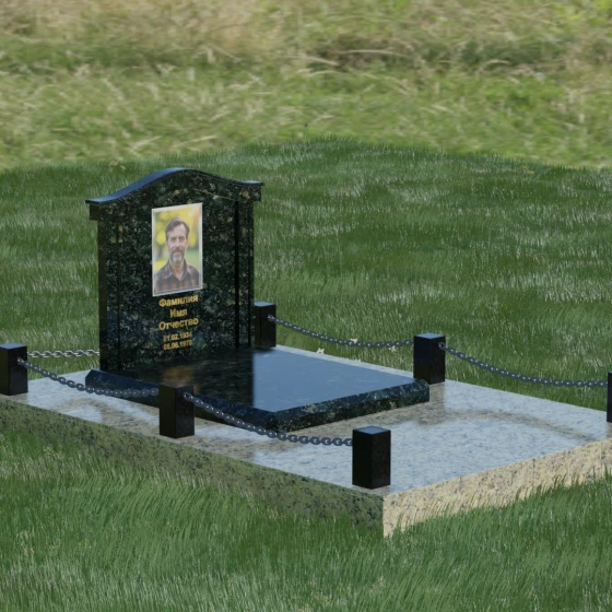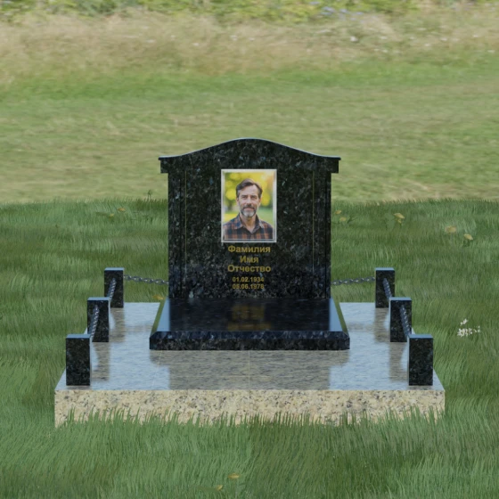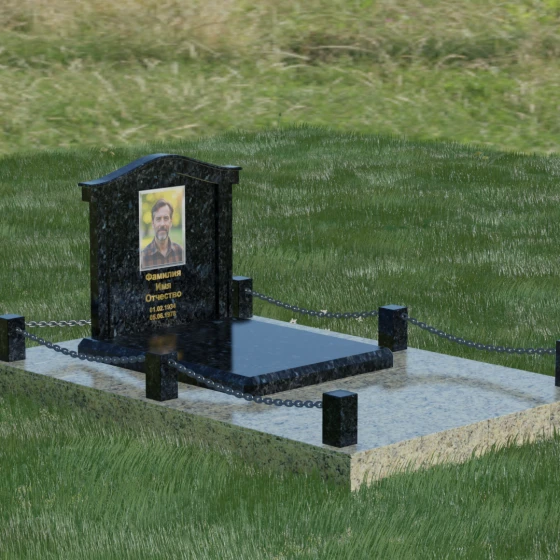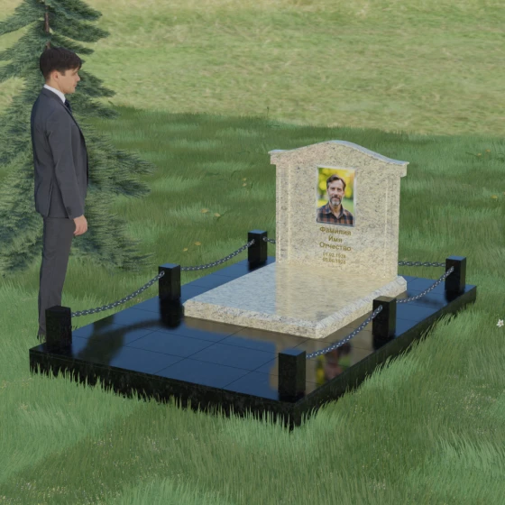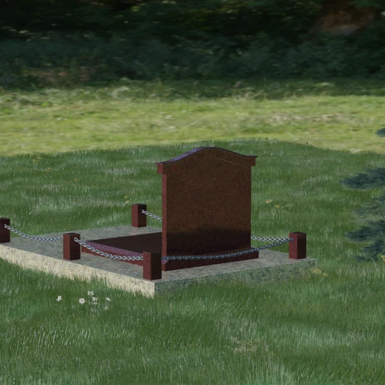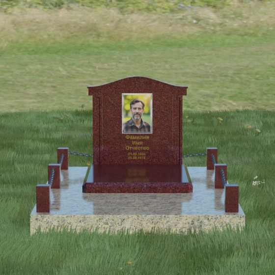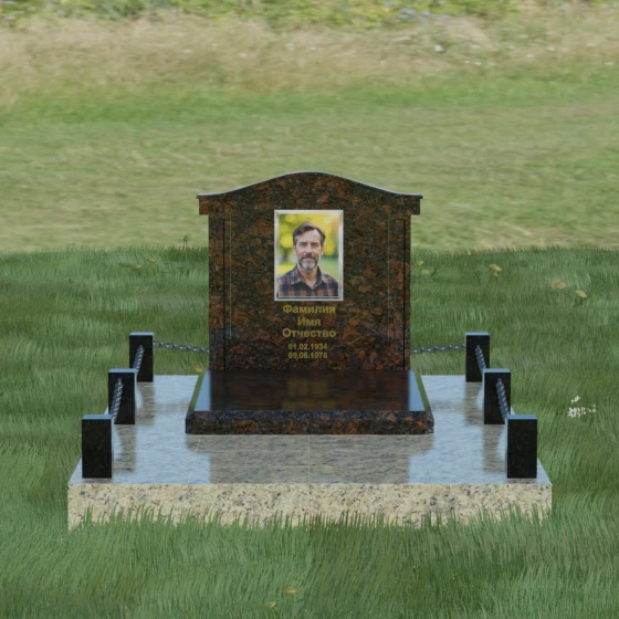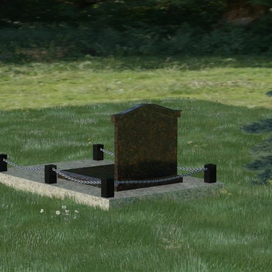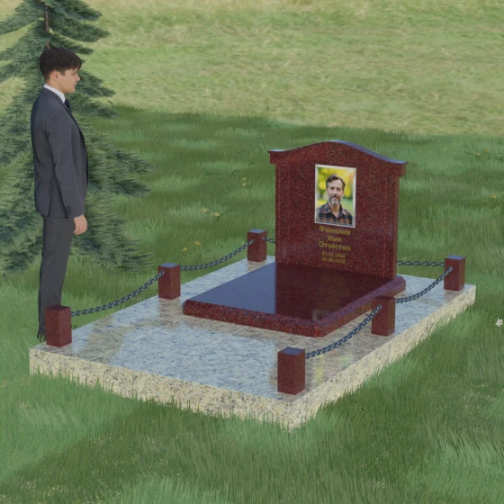 Данный ансамбль спроектирован как завершенная архитектурная форма, включающая в себя не только основную стелу, но и продуманную систему ограждения участка. Мемориальная композиция установлена на массивное основание, облицованное гранитными плитами. Такое решение не только придает эстетическую целостность, но и гарантирует долговечность конструкции, предотвращая проседание грунта и упрощая уход за территорией. По периметру расположены мощные каменные столбики (цоколи), соединенные декоративными цепями. Эти элементы создают четкую визуальную границу, подчеркивая приватность и сакральность места.