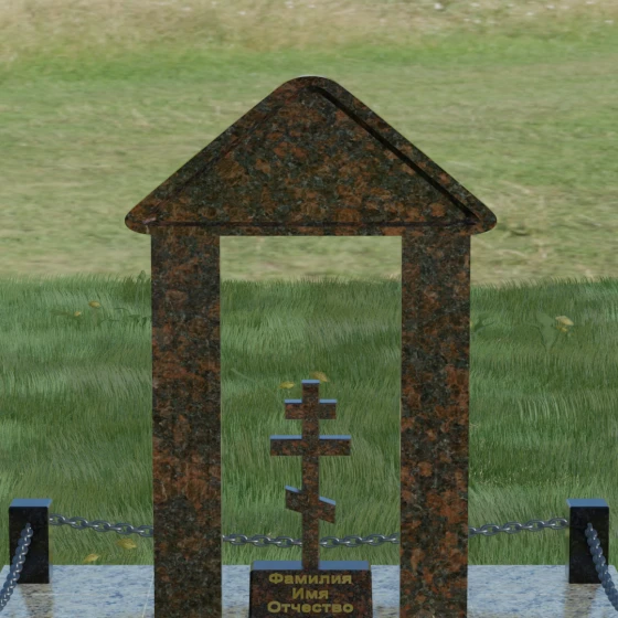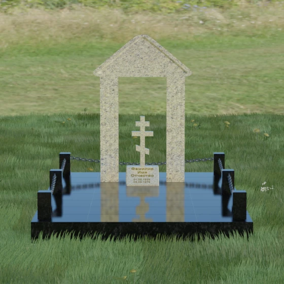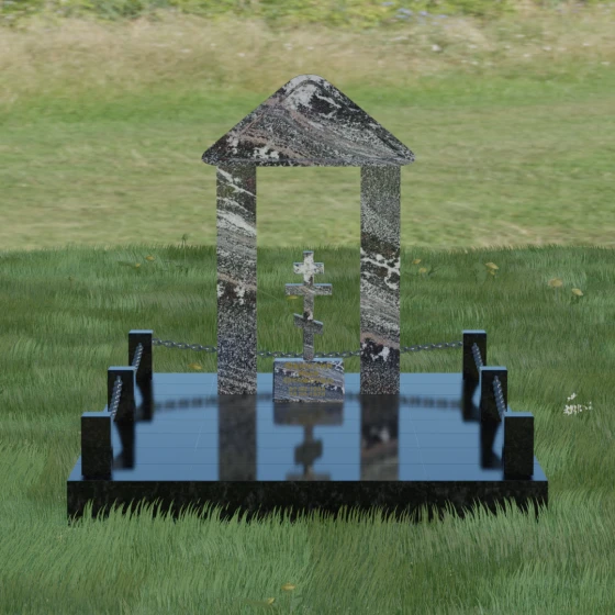 Модель №053 — это не просто памятник, а величественный мемориальный ансамбль, выполненный в лучших традициях храмового зодчества. Центральное место в композиции занимает надгробие из натурального камня, спроектированное в форме открытой арки или стилизованной часовни. Такая архитектурная форма символизирует небесные врата и покровительство высших сил. Внутри арочного свода, на отдельном постаменте, возвышается канонический православный восьмиконечный крест. Его строгие, безупречно выверенные пропорции подчеркивают глубокую веру и смирение, а объемная резьба придает элементу особую значимость. Массивное треугольное навершие (фронтон) венчает конструкцию, создавая ощущение завершенности и монументального спокойствия.