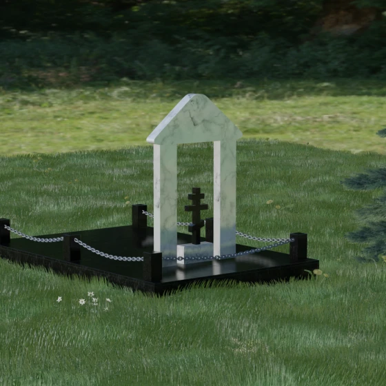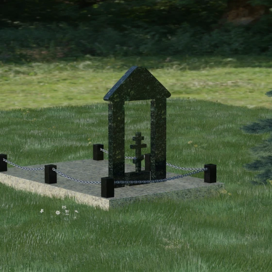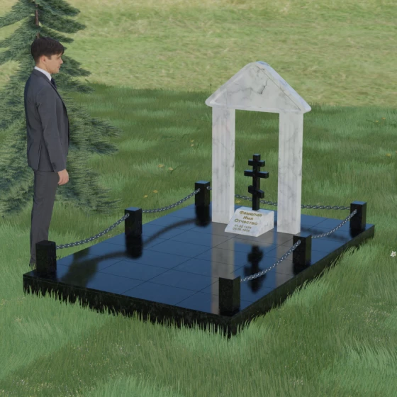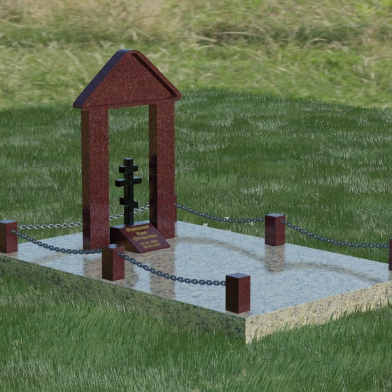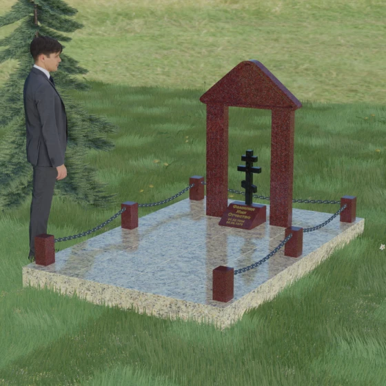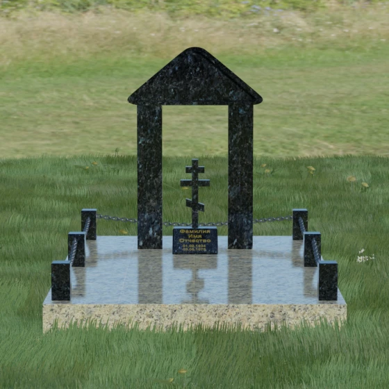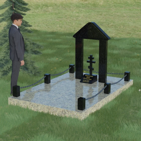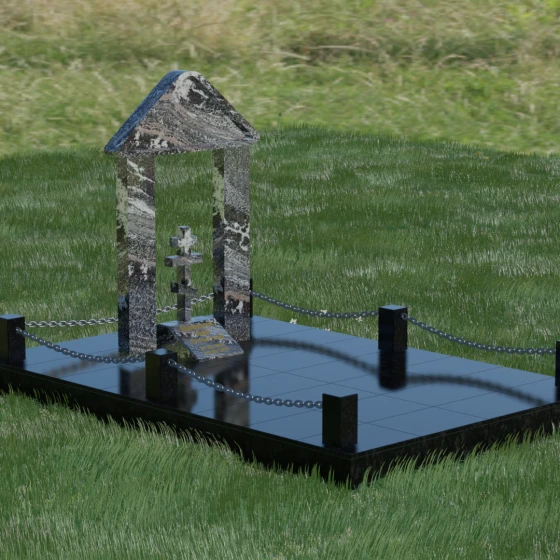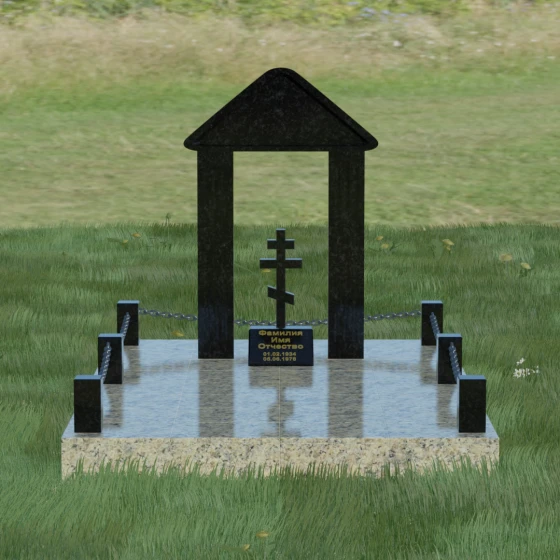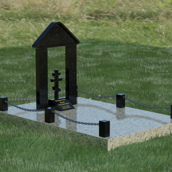 Эстетика данного комплекса строится на игре объемов и безупречной обработке каждой грани. Мастер-камнерез уделяет особое внимание полировке: зеркальный блеск основных плоскостей контрастирует с глубокими фасками и фальцами, которые подчеркивают геометрию арки. Благоустройство участка продумано до мелочей. Вся прилегающая территория закрыта сплошной полированной плитой, что не только придает мемориалу "дорогой" и законченный вид, но и гарантирует чистоту участка на десятилетия. Периметр обозначен строгими каменными столбиками, соединенными декоративными цепями, что создает четкую визуальную границу священного пространства и защищает его от внешних воздействий.