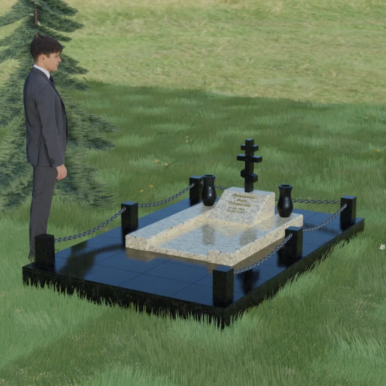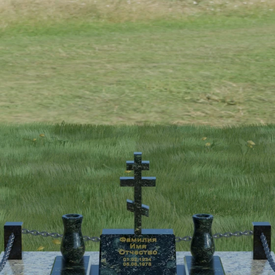 Особого внимания заслуживает художественная игра контрастов, реализованная в этой модели. Основная плита и декоративные элементы выполнены из глубокого черного камня с зеркальной полировкой, которая отражает окружающий мир, создавая эффект глубины. Стела имеет горизонтальную ориентацию, что позволяет разместить информацию максимально лаконично и читаемо. По обе стороны от центральной части расположены две изящные гранитные вазы, чьи плавные, точеные формы смягчают строгость прямых углов. Завершенность мемориальному комплексу придает массивное основание — надгробная плита, выполненная из гранита контрастного светлого оттенка. Такое решение не только эстетично, но и максимально практично: сплошное мощение участка полностью исключает рост сорной травы и необходимость сложного ухода за грунтом, сохраняя безупречный вид захоронения на десятилетия.