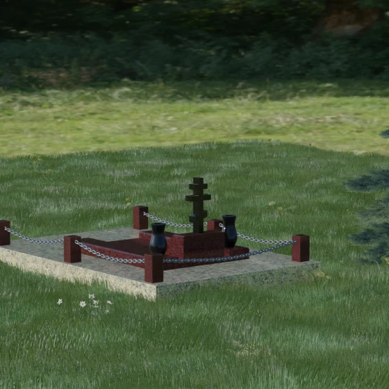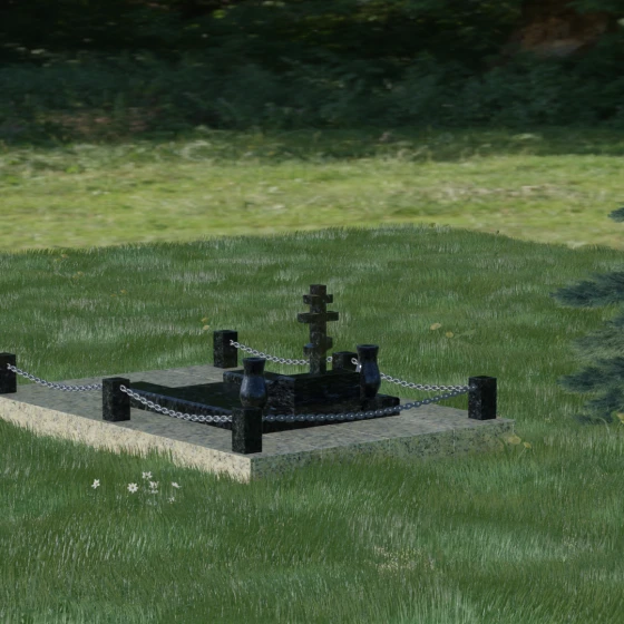 - Благоустройство: Комплектация включает гранитный цоколь по периметру, представленный строгими квадратными столбиками, соединенными декоративной металлической цепью.