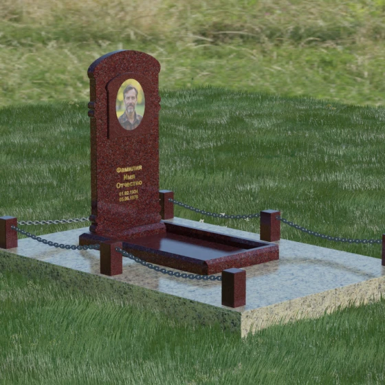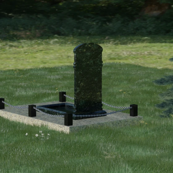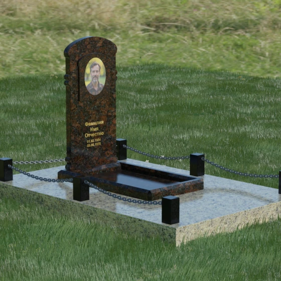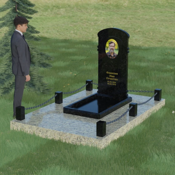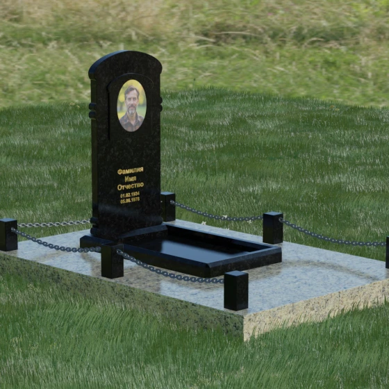 Благоустройство участка продумано до мелочей и формирует законченное сакральное пространство. Основание мемориала установлено на массивный гранитный цоколь, который служит надежным фундаментом и защищает конструкцию от сезонных изменений почвы. Территория полностью облицована широкоформатными полированными плитами — такое решение не только придает эстетическую завершенность, но и гарантирует безупречный вид участка на десятилетия, сводя уход за ним к минимуму. По периметру установлены строгие квадратные столбики из камня, соединенные декоративными цепями. Эта деталь визуально очерчивает границы личного пространства, создавая атмосферу уединения и покоя, отделяя место памяти от остального мира.