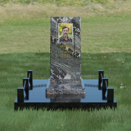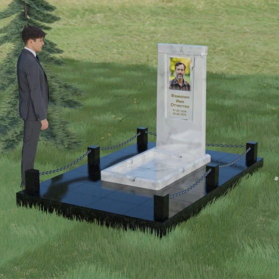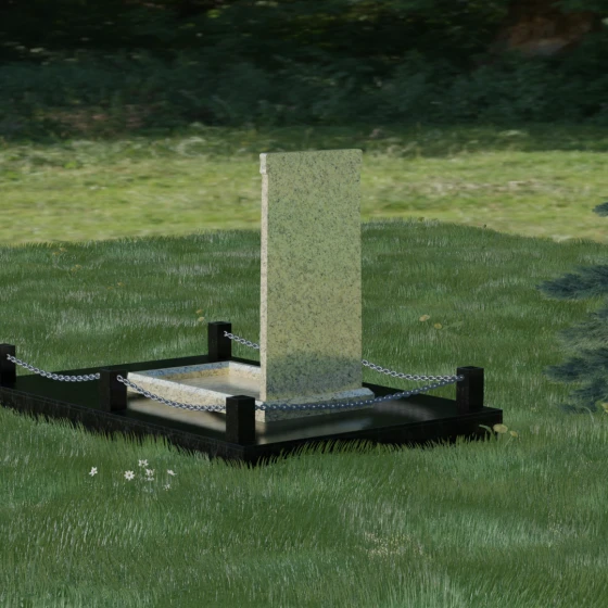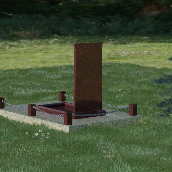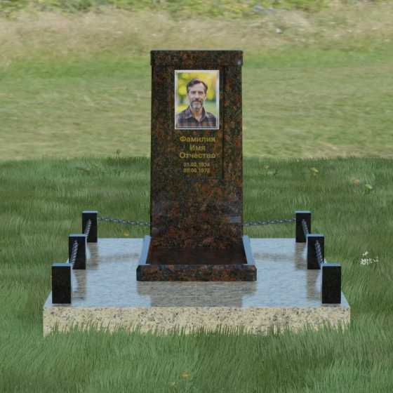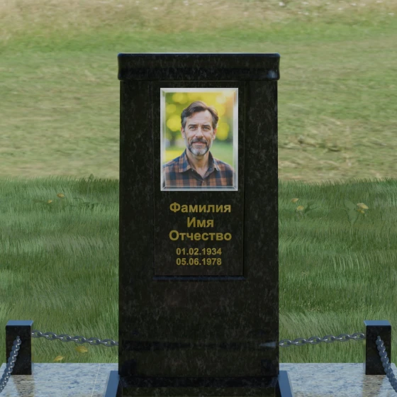Особое внимание уделено благоустройству прилегающей территории. Монумент устанавливается на прочный гранитный цоколь, который служит надежным фундаментом и предотвращает перекос конструкции со временем. Участок полностью облицован массивными плитами из натурального камня в едином стиле с основным изделием. Такое решение не только придает захоронению законченный и опрятный вид, но и значительно упрощает уход за ним, исключая прорастание сорной травы. Периметр композиции обозначен строгими гранитными столбиками, соединенными декоративными цепями. Эти элементы создают визуальную границу уединения и покоя, превращая место памяти в достойный архитектурный ансамбль. Внутренняя ниша стелы идеально подходит для размещения широкоформатной фотокерамики или гравировки, дополненной покрытием сусальным золотом, что особенно эффектно смотрится на темных сортах камня.