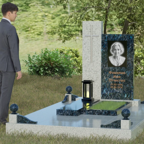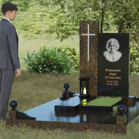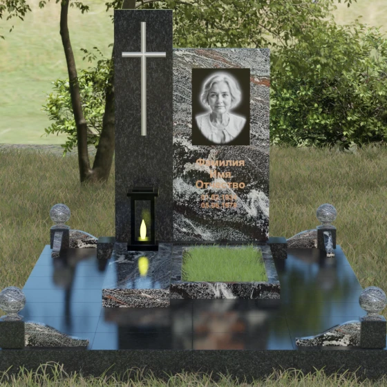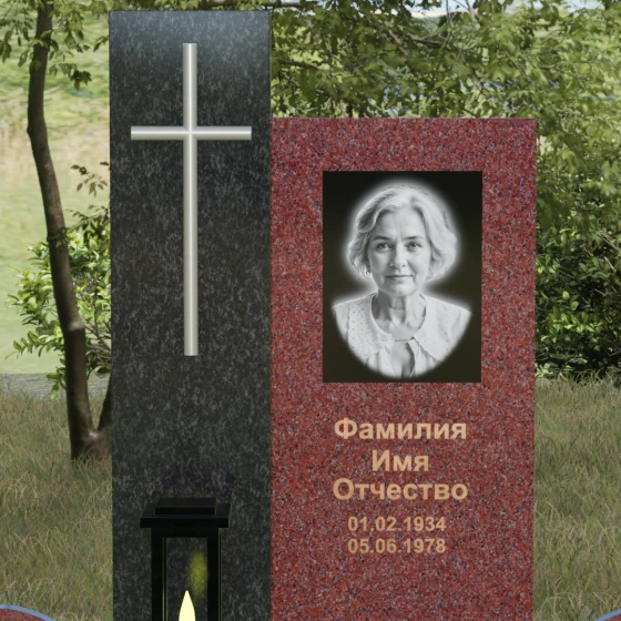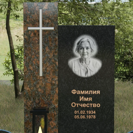 Центральным элементом выступает вертикальная стела, состоящая из двух контрастных блоков, символизирующих дуальность бытия. Левая часть композиции выполнена в виде высокого узкого пилона из насыщенного цветного гранита. На его фронтальной стороне закреплен лаконичный четырехконечный крест с благородным металлическим напылением. Отсутствие лишнего декора на кресте подчеркивает торжественность и строгость момента. Правое крыло стелы — более широкое и основательное — служит идеальным полотном для нанесения портрета и эпитафии. Контраст между глубоким темным оттенком основной плиты и ярким акцентом левой части создает динамику, притягивающую взгляд, но сохраняющую общее настроение светлой грусти.