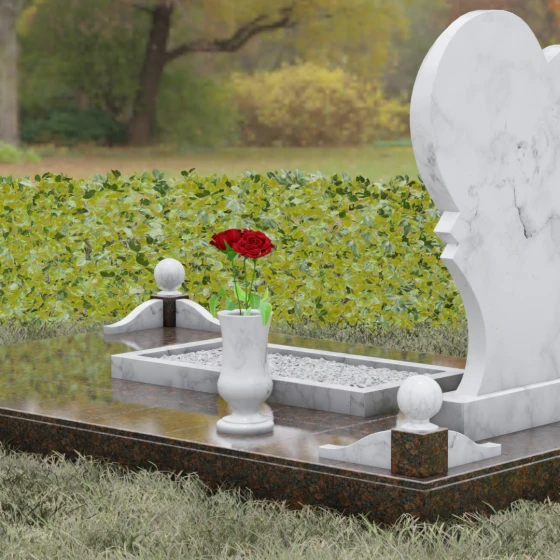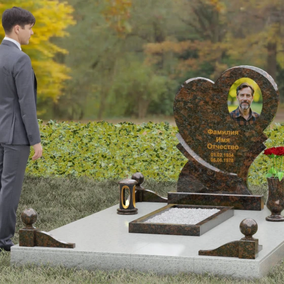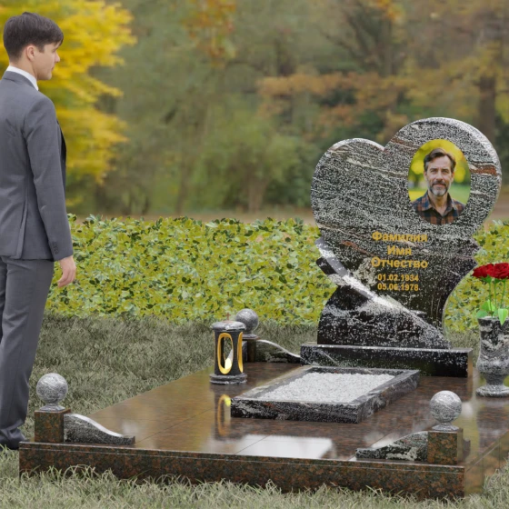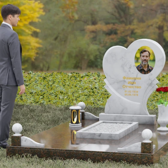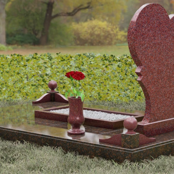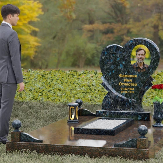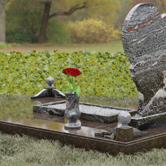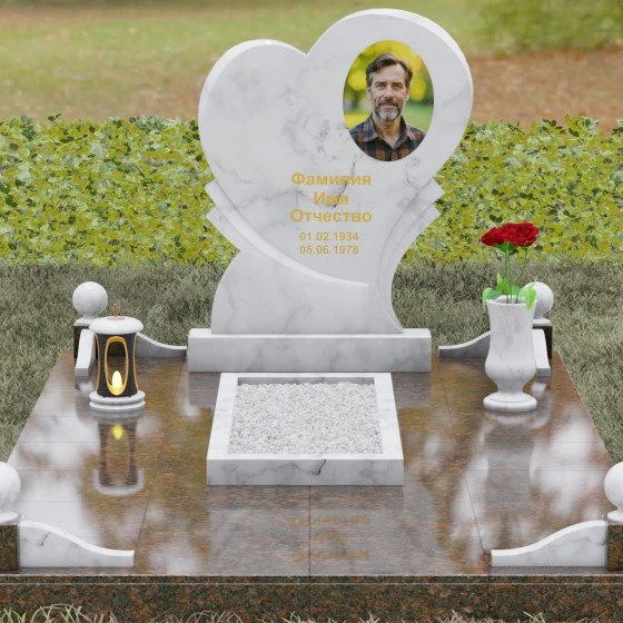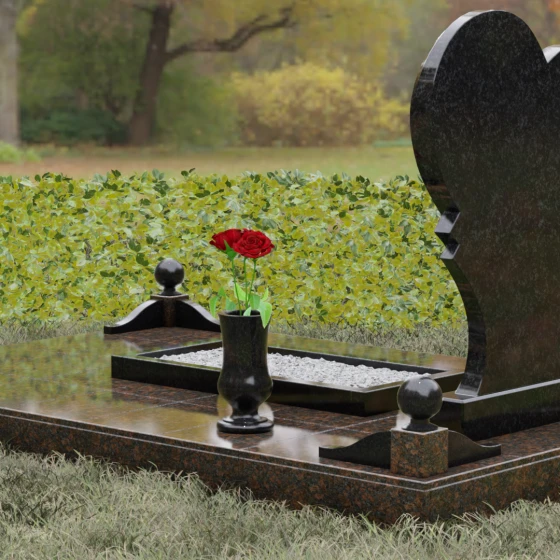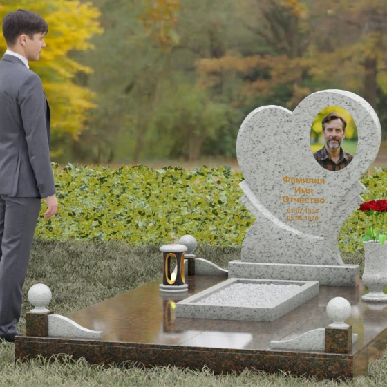 Выбор мемориала в форме сердца — это всегда глубоко личное решение, продиктованное желанием выразить бесконечную любовь и нежность к ушедшему человеку. Представленная модель (Артикул 107) — это не просто памятник, а сложная архитектурная композиция, в центре которой находится величественная стела. Её уникальность заключается в асимметричном исполнении: основная форма сердца дополнена изящным резным элементом у основания, что создает эффект многослойности и визуального объема. Плавные, текучие линии контура гармонично сочетаются со строгой геометрией основания, олицетворяя баланс между земной твердью и возвышенными чувствами.