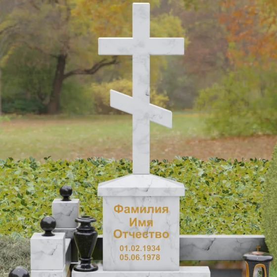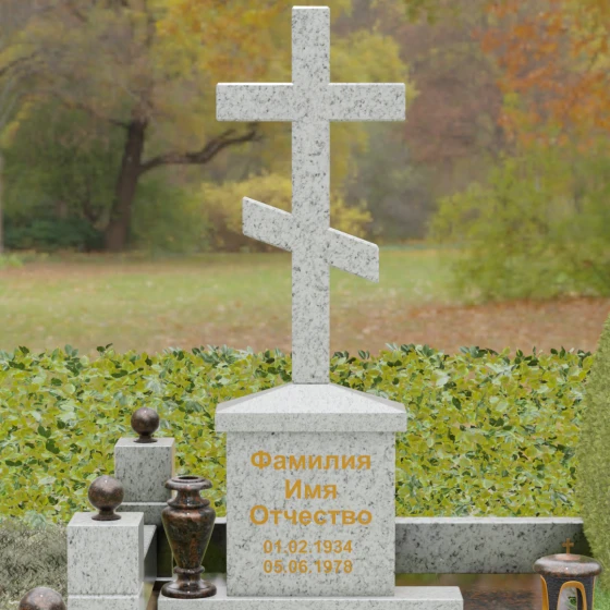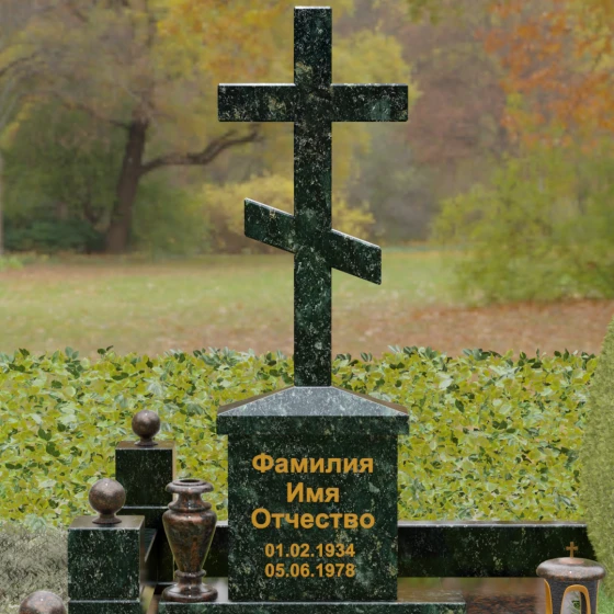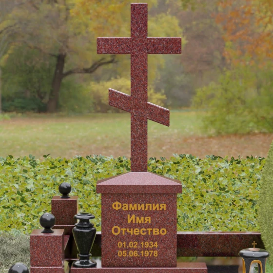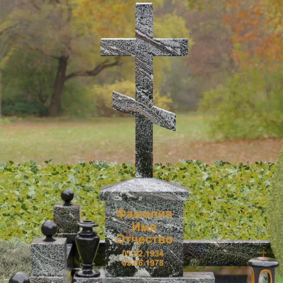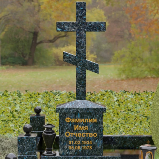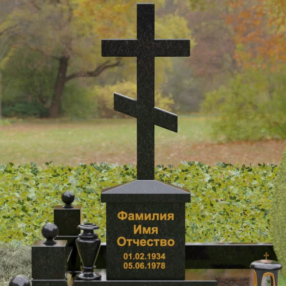 Центральным элементом композиции является Величественная стела, выполненная в форме классического восьмиконечного православного креста. Крест не просто вырезан из камня — он обладает внушительным объемом и безупречной геометрией. Лаконичность исполнения подчеркивает статусность изделия: здесь нет лишней суеты, только чистые линии и зеркальная полировка, в которой отражается само небо. Крест возвышается на массивном прямоугольном постаменте-тумбе, где золотыми буквами наносится основная информация. Такое конструктивное решение придает всей композиции вертикальную устойчивость и визуальную мощь.