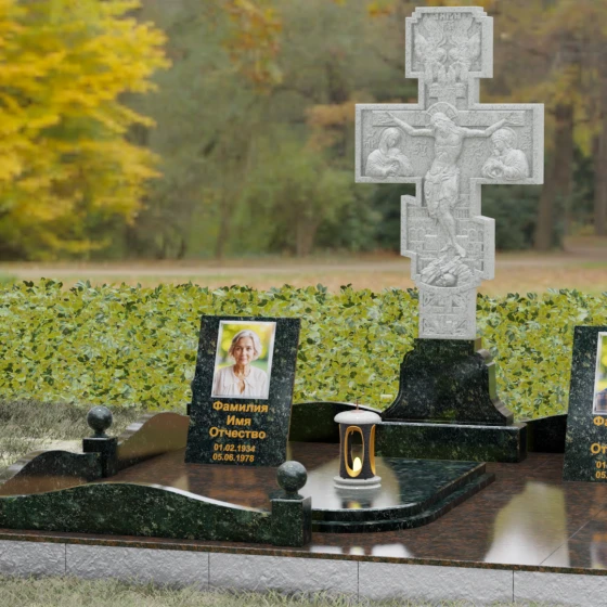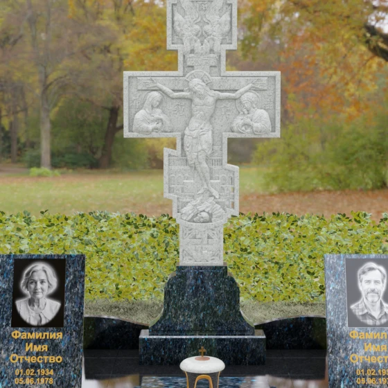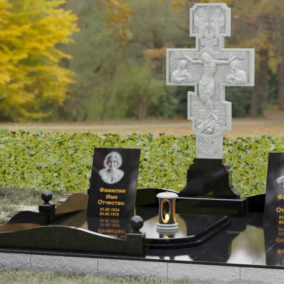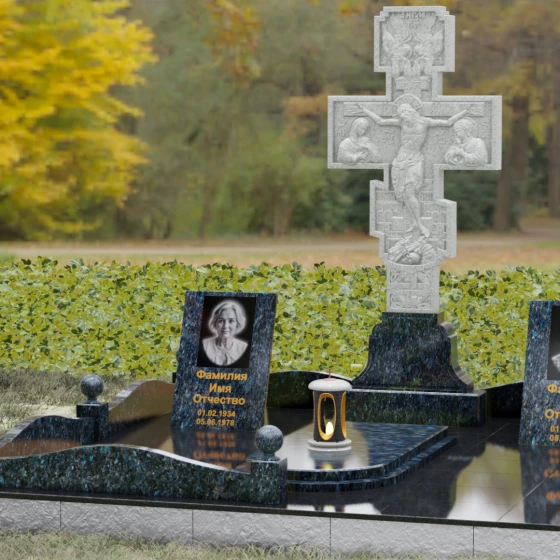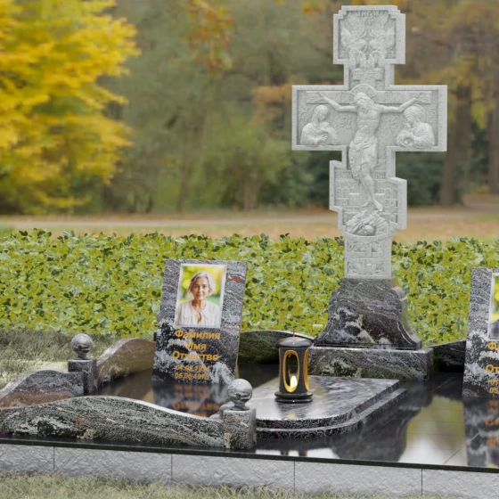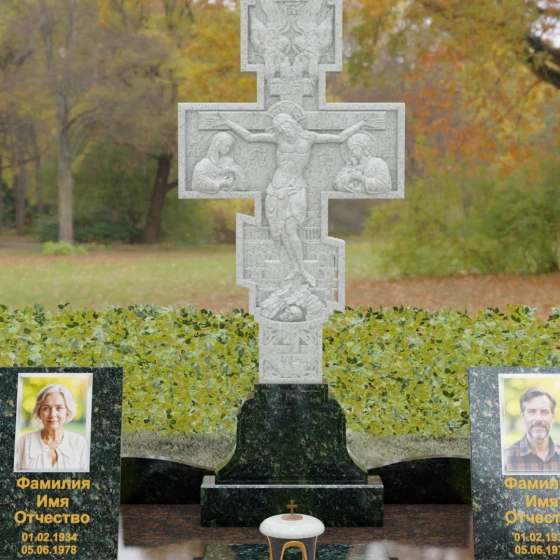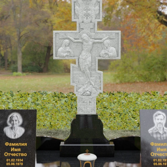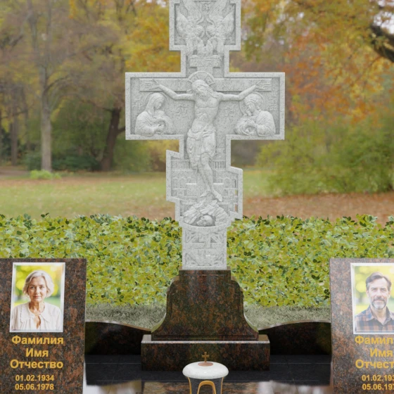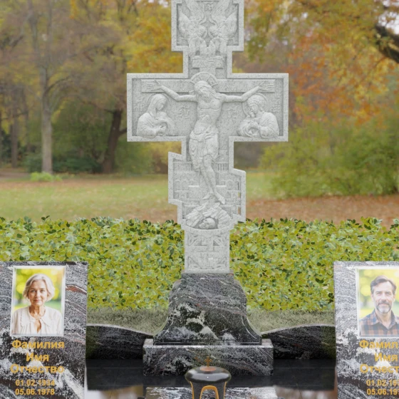 Данный мемориальный ансамбль представляет собой совершенный баланс между духовными традициями и современной архитектурной эстетикой. В центре композиции находится величественная стела в форме высокого православного креста, украшенного детальной многоуровневой резьбой. Барельефное изображение Распятия, выполненное с глубокой проработкой каждой детали — от складок плащаницы до ликов предстоящих, — создает ощущение покоя и благодати. Светлая, матовая фактура резного камня эффектно контрастирует с зеркально отполированными боковыми элементами, предназначенными для увековечивания памяти близких.