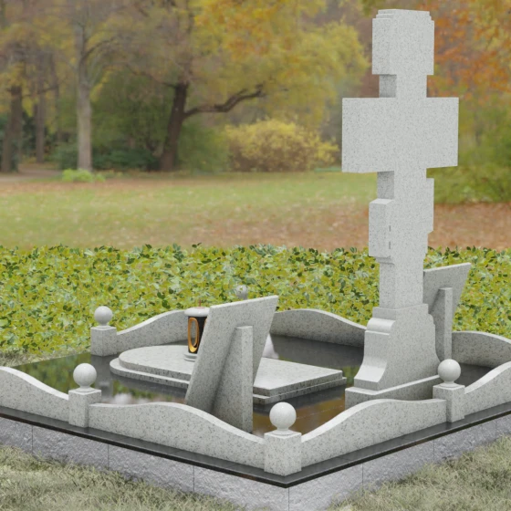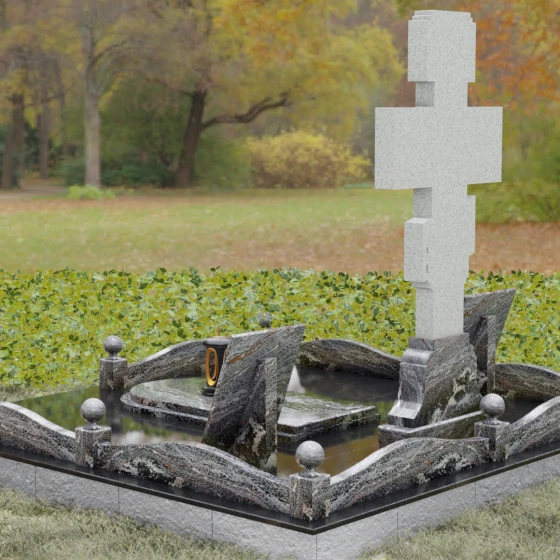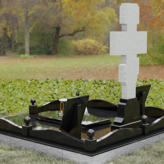 Особое внимание в этой модели уделено геометрии и пластике линий. Плавные изгибы цоколя и волнообразные формы боковых стел символизируют бесконечность жизненного пути и тихую гавань вечного упокоения. Эти мягкие переходы лишают монумент излишней суровости, превращая его в изысканный мемориальный объект, который гармонично вписывается в ландшафт, создавая атмосферу умиротворения и высокого стиля.