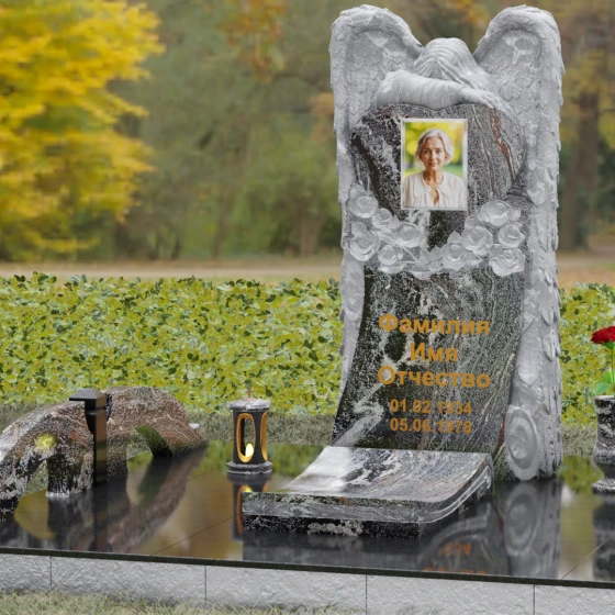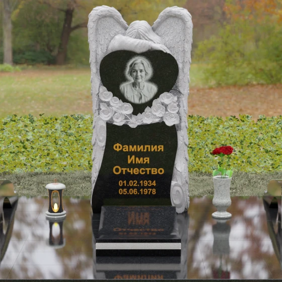 Данная мемориальная композиция представляет собой истинное произведение ритуального искусства, где каждый элемент пропитан глубоким символизмом и благородством. Центральным художественным образом выступает величественная фигура скорбящего ангела, чьи массивные крылья бережно, словно в последней попытке защитить, обрамляют стелу в форме сердца. Мастерство камнереза здесь проявляется в искусной игре контрастов: матовая, детально проработанная фактура оперения крыльев и драпировок одежды небесного покровителя противопоставлена зеркально отполированной глади черного гранита. Именно на этой поверхности, лишенной малейших изъянов, свет преломляется наиболее эффектно, создавая ощущение глубины и монументальности.
