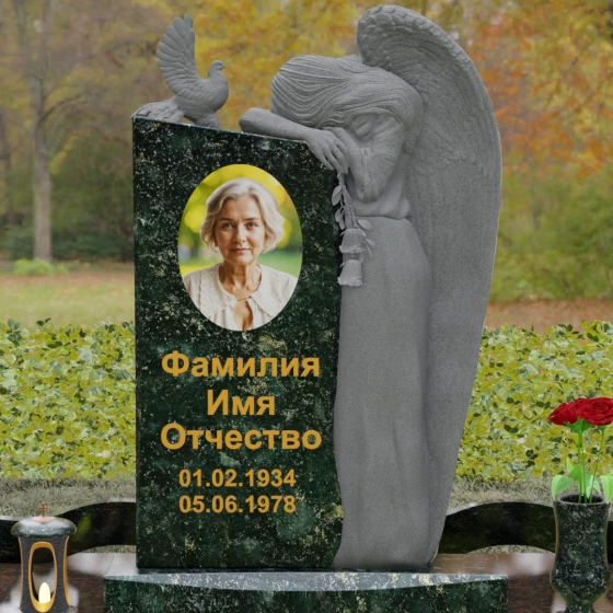 Представленный мемориальный ансамбль (Артикул 129) — это не просто памятный знак, а глубокое архитектурное высказывание, в котором застывшая в камне скорбь обретает форму высокого искусства. Величественная стела доминирует в композиции, представляя собой сложный симбиоз строгой геометрии и филигранной художественной резьбы. Центральным элементом является объемная фигура скорбящего ангела, выполненная в технике глубокого барельефа. Мастерски переданная пластика крыльев с детальной проработкой каждого перышка создает ощущение мягкости, которая парадоксальным образом контрастирует с твердостью натурального камня. Склоненный лик ангела и тонкие складки его одеяний, выполненные в матовом срезе, эффектно выделяются на фоне зеркально полированной поверхности основной плиты. В руках небесного покровителя застыла роза — символ вечной любви, чьи лепестки проработаны с исключительным вниманием к объему и естественности линий.