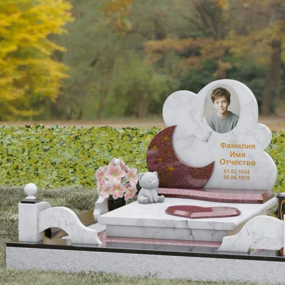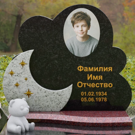 Данная мемориальная композиция — это воплощение нежности, глубокой любви и тихой грусти, застывшей в благородном камне. Выбор такой формы продиктован желанием выразить самые светлые чувства к ушедшему близкому человеку. Силуэт стелы, выполненный в виде мягкого, кучевого облака с плавными, округлыми очертаниями, символизирует покой и вечную жизнь души в небесных сферах. Асимметричная геометрия придает монументу индивидуальность, выделяя его среди строгих прямоугольных форм, и создает ощущение легкости, несмотря на внушительный вес натурального гранита. Особый акцент сделан на игре фактур и цветов: основная часть монумента из темного камня гармонично сочетается со вставкой из светлого гранита в форме изящного полумесяца. На этом светлом фоне выгравированы лаконичные золотые звезды, которые словно освещают путь памяти через десятилетия.