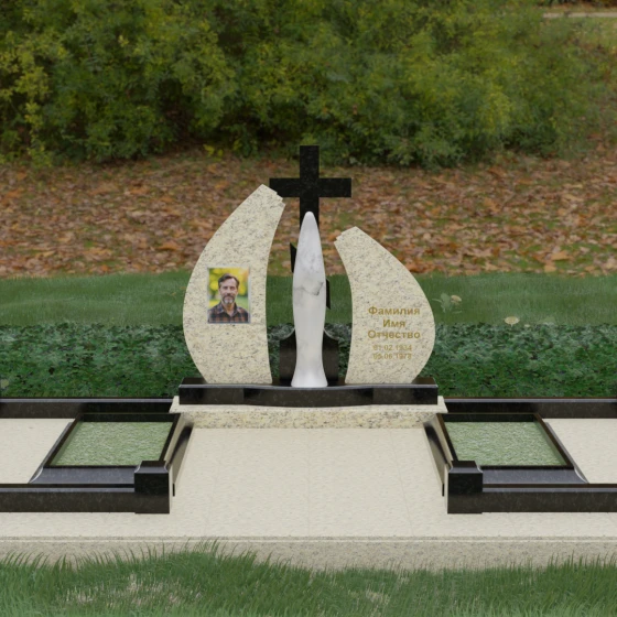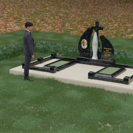 Особое внимание привлекает игра фактур: идеально гладкая, зеркальная полировка основных плоскостей камня соседствует с матовым, бархатистым исполнением центральной статуи. Такое сочетание позволяет свету играть на гранях мемориального комплекса, создавая глубокие тени и яркие блики, что придает всей конструкции дополнительный объем и монументальность. Это решение подчеркивает статусность мемориала и его эстетическое совершенство, делая его доминантой на месте захоронения.