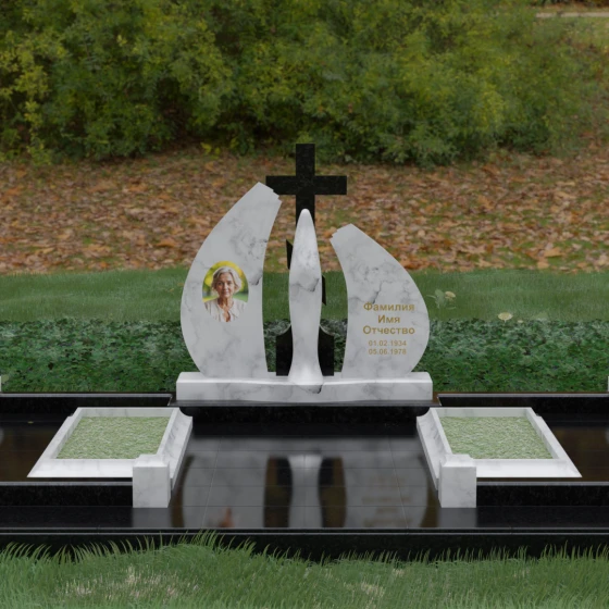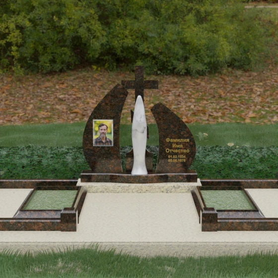 Эта величественная стела представляет собой не просто мемориальный знак, а глубоко продуманную художественную композицию, в которой каждая линия наполнена смыслом. Центральным элементом мемориала является изящная скульптура Скорбящей матери, выполненная в мягком белом цвете. Её плавный силуэт, напоминающий застывшую молитву, контрастирует со строгим и лаконичным православным крестом, венчающим композицию. Форма боковых элементов стелы напоминает два крыла или два лепестка пламени, которые бережно обрамляют центральную фигуру, создавая ощущение защиты и вечного покоя.