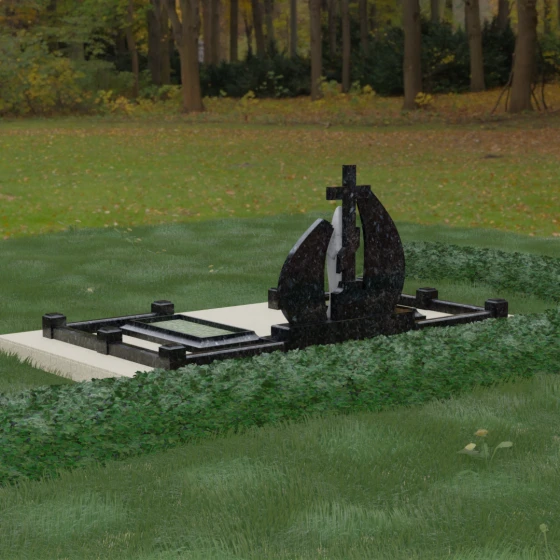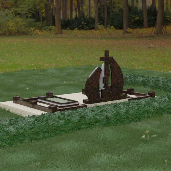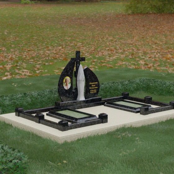 Внутри периметра предусмотрены два симметричных открытых цветника, которые позволяют внести живые краски в строгую геометрию камня. Конструкция стелы идеально сбалансирована для размещения парных портретов или надписей. Левое «крыло» традиционно отводится под гравировку портрета, где на темном полированном фоне изображение будет выглядеть максимально четким и контрастным. Правая часть предназначена для эпитафии и имен, нанесенных глубокой гравировкой с возможным золочением букв. Весь ансамбль продуман так, чтобы передать теплоту ваших чувств и сохранить память о дорогих людях в самом достойном виде.