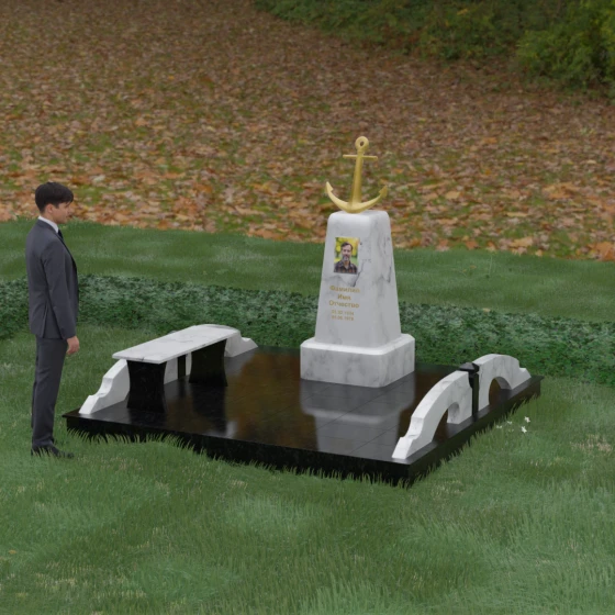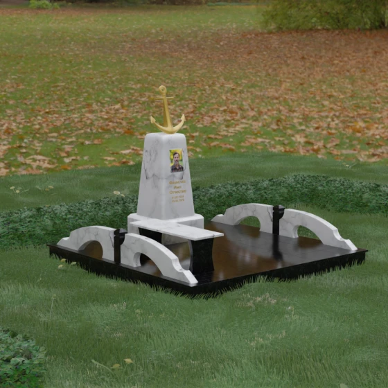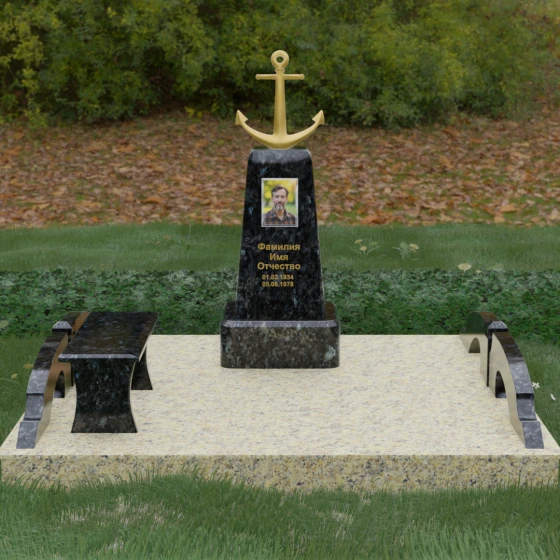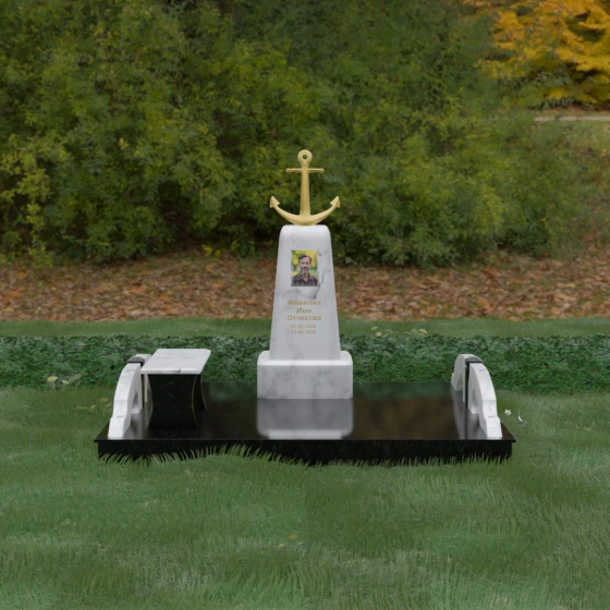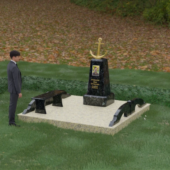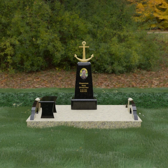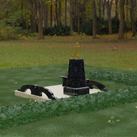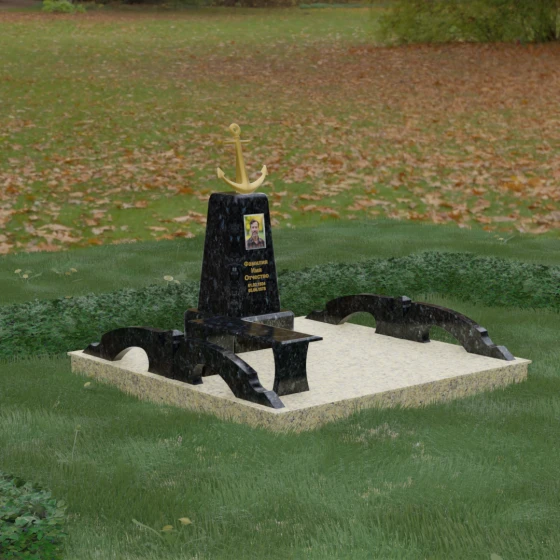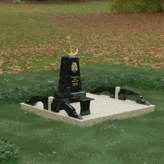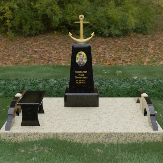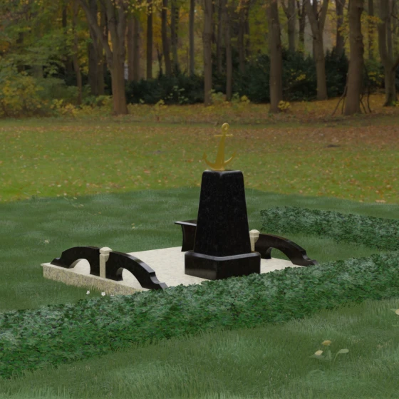 Художественное исполнение монумента строится на тонкой игре контрастов. Зеркальная полировка глубокого черного камня (в базовом варианте) отражает окружающий мир, создавая ощущение глубины и чистоты. В то же время рельефный якорь и золоченая гравировка вносят в композицию теплоту и торжественный блеск. Плавные изгибы боковых элементов и ножек скамьи символизируют бесконечность жизненного пути и гармонию, смягчая строгость центрального обелиска. Каждая грань камня обработана с безупречной точностью, что обеспечивает не только эстетическую привлекательность, но и долговечность изделия.