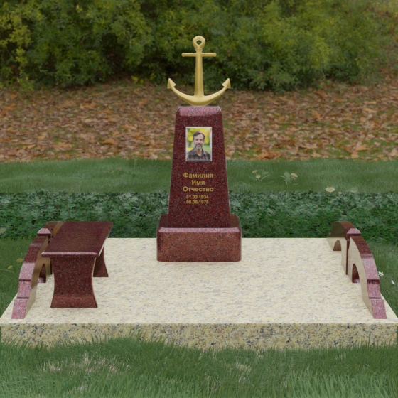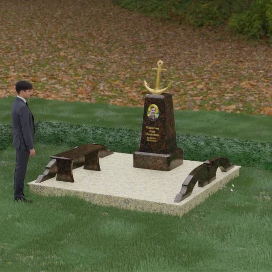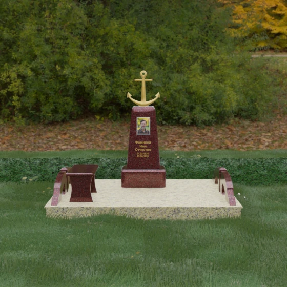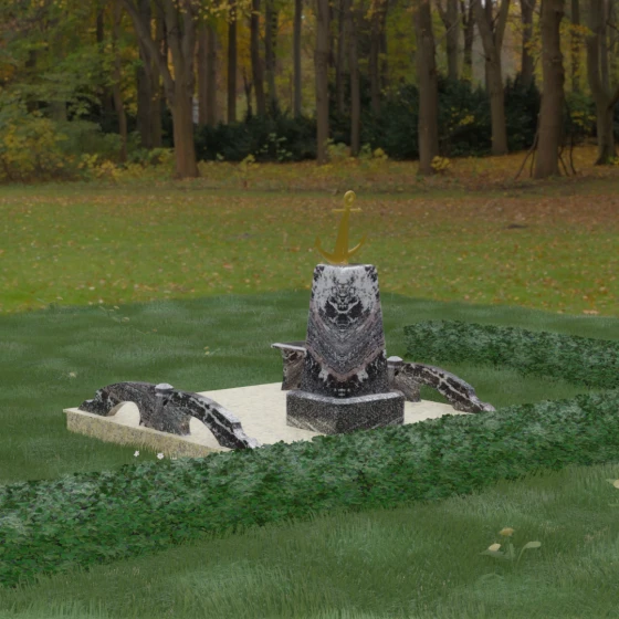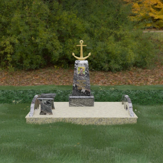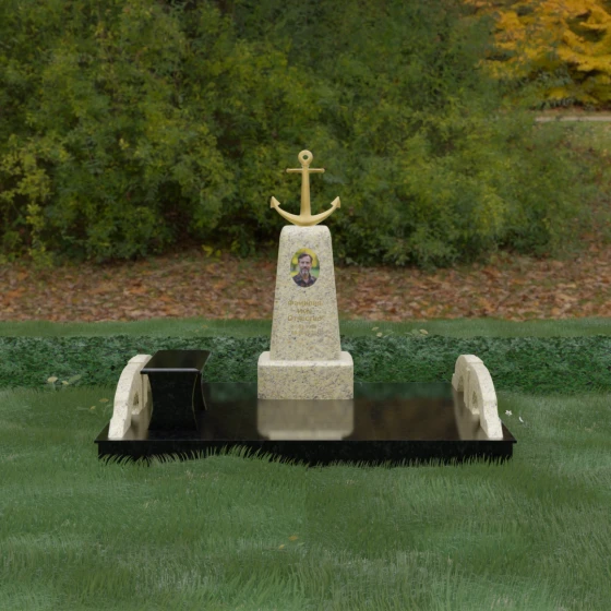 Представленная мемориальная композиция под артикулом 179 — это не просто дань памяти, а глубокое архитектурное высказывание, воплощенное в благородном камне. Центральное место в ансамбле занимает величественная стела, форма которой напоминает строгий и уверенный постамент. Её сужающиеся кверху грани создают эффект устремленности ввысь, подчеркивая монументальность и торжественность образа. Венчает конструкцию массивный золоченый якорь — символ надежды, твердости духа и верности своему причалу. Этот декоративный элемент, выполненный с высокой степенью детализации, становится смысловым центром, указывая на профессиональный путь или сильный характер усопшего.