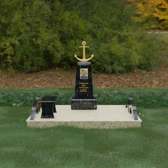 Оформление: Для данной формы изваяния идеально подходит классическая портретная керамика в овальной раме, которая гармонично вписывается в геометрию стелы. ФИО и даты жизни рекомендуется выполнять методом глубокой гравировки с последующим покрытием сусальным золотом или качественной краской «под золото». Это создаст визуальное единство с якорем и придаст всей композиции завершенный, премиальный вид, который будет читаться даже на расстоянии.