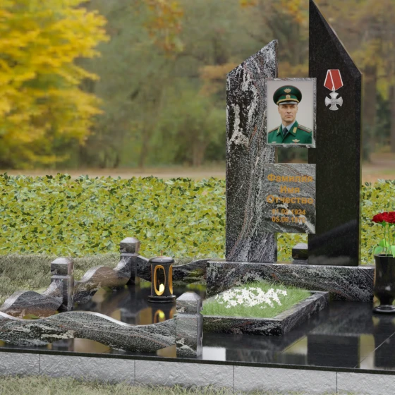 Центральным элементом ансамбля выступает сложная двухсоставная стела, представляющая собой две вертикальные плиты разной высоты. Их вершины оформлены в виде острых диагональных срезов, которые устремлены ввысь, создавая динамичный и одновременно устойчивый силуэт, напоминающий склоненные знамена или вершины гор. Грани камня подвергнуты многоступенчатой зеркальной полировке, что обеспечивает безупречную игру света на поверхности. В центральной части расположена прямоугольная ниша с портретом, а справа — объемный металлический барельеф в виде ордена Мужества, выполненный с высокой степенью детализации. Золоченая гравировка шрифта с глубокой выборкой идеально контрастирует с темным фоном, придавая надписям объем и обеспечивая их читаемость на многие десятилетия.