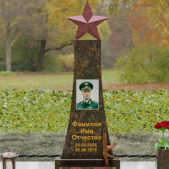 Мемориальный комплекс под артикулом 190 — это воплощение мужества, дисциплины и вечной памяти о человеке, чья жизнь была неразрывно связана с воинским долгом. Центральное место в композиции занимает высокая вертикальная стела, имеющая строгую, сужающуюся кверху геометрию. Такая форма выбрана неслучайно: она создает мощную визуальную вертикаль, направляющую взгляд зрителя ввысь, символизируя духовное восхождение и бессмертие подвига. Венчает монумент объемная пятиконечная звезда насыщенного красного цвета — символ чести и принадлежности к офицерскому корпусу. Одной из самых значимых и уникальных деталей данной модели является реалистично выполненная объемная фигура автомата Калашникова, прислоненного к боковой грани стелы. Этот элемент резьбы выполнен с безупречной точностью, подчеркивая профессиональный путь усопшего. Надгробие из натурального камня в таком исполнении выглядит величественно и бескомпромиссно, заявляя о силе характера того, кому оно посвящено.