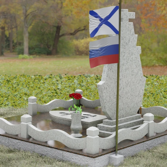 Особое внимание стоит уделить игре фактур, которая раскрывается в деталях резьбы. Центральная часть стелы, предназначенная для портрета и надписей, обладает безупречной зеркальной полировкой. В ней, как в чистом источнике, отражается окружающий мир, создавая ощущение легкости и света. В то же время внутренние углы ступенчатых вырезов и грани креста могут иметь более матовую, бархатистую поверхность, что создает благородный контраст и подчеркивает объемность каждой детали. Этот ансамбль выглядит завершенным благодаря продуманному благоустройству участка. Стела установлена на массивное основание, которое переходит в элегантную декоративную ограду. Столбики с аккуратными фасками и плавно изогнутые, волнообразные перекладины из того же камня очерчивают границы сакрального места, создавая атмосферу уединения. Дополняет композицию изящная каменная ваза, установленная у подножия, позволяя близким выразить свою любовь через живые цветы.