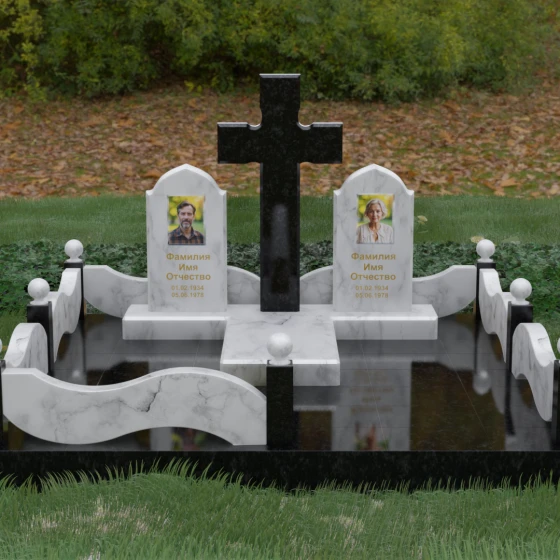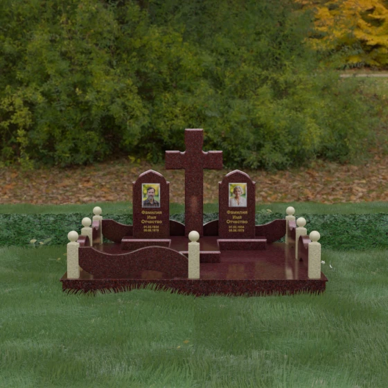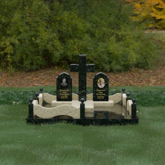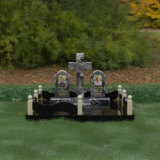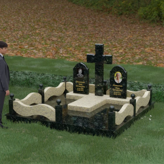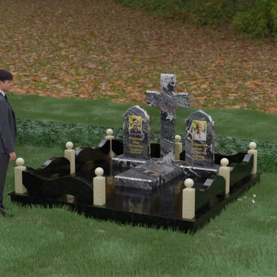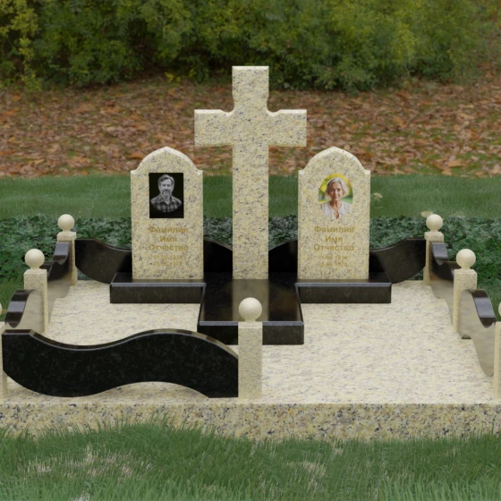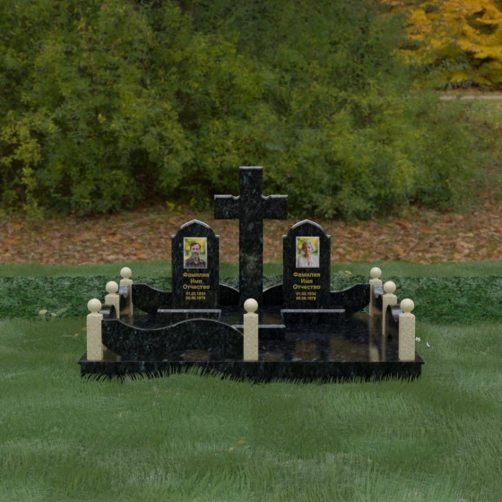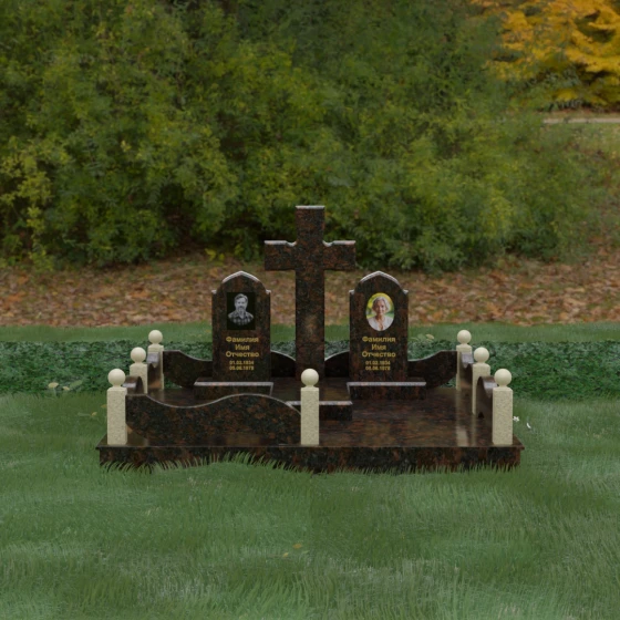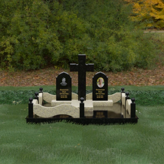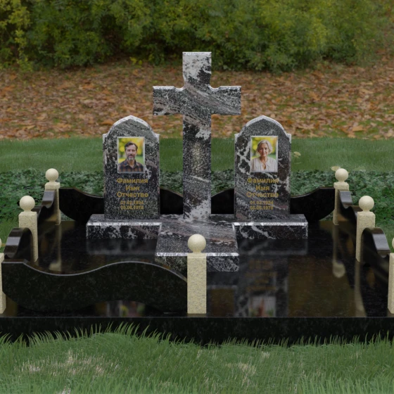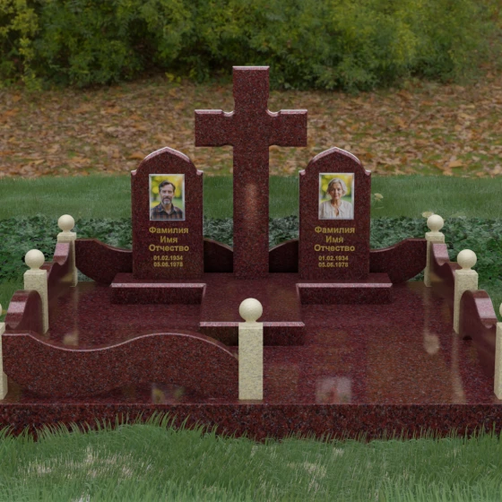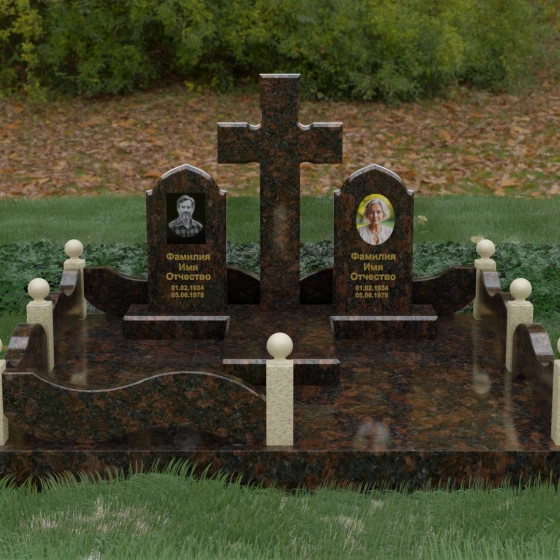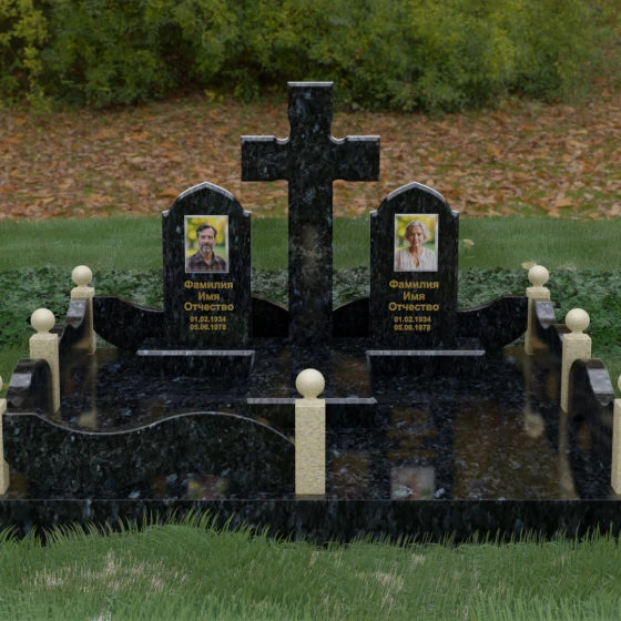 Выбор места памяти для двоих близких людей — это всегда поиск гармонии между монументальностью и глубоким духовным смыслом. Данный гранитный монумент представляет собой величественный мемориальный ансамбль, в центре которого возвышается массивный православный крест. Его строгая геометрия с характерными ступенчатыми выступами на перекладинах придает композиции архитектурную завершенность и сакральную значимость. По обе стороны от символа веры расположены парные памятные плиты с изящными арочными вершинами, напоминающими купола храмов. Такая форма олицетворяет небесный свод и покой, создавая атмосферу умиротворения и вечной памяти.