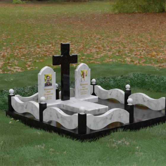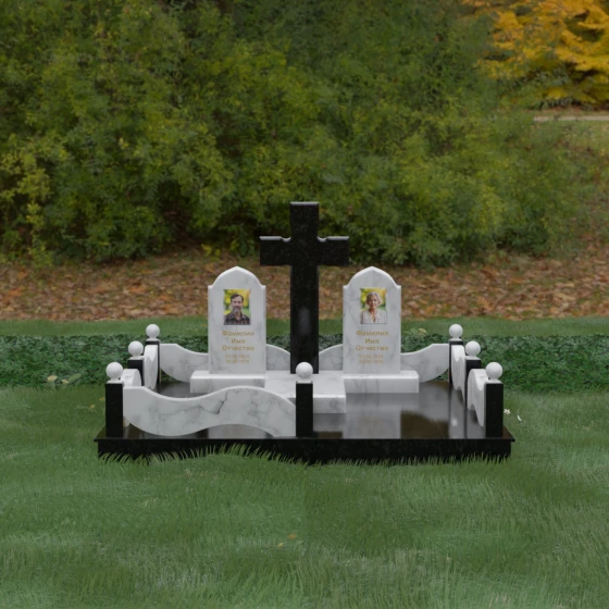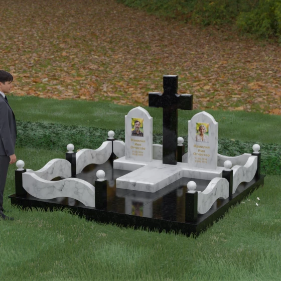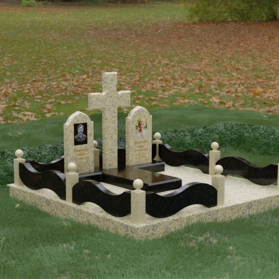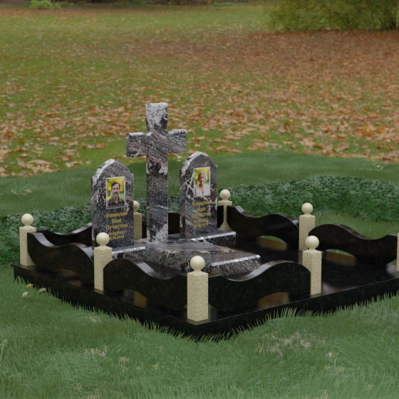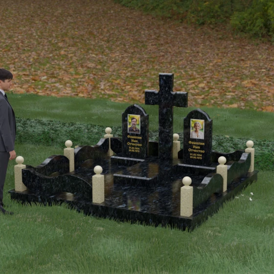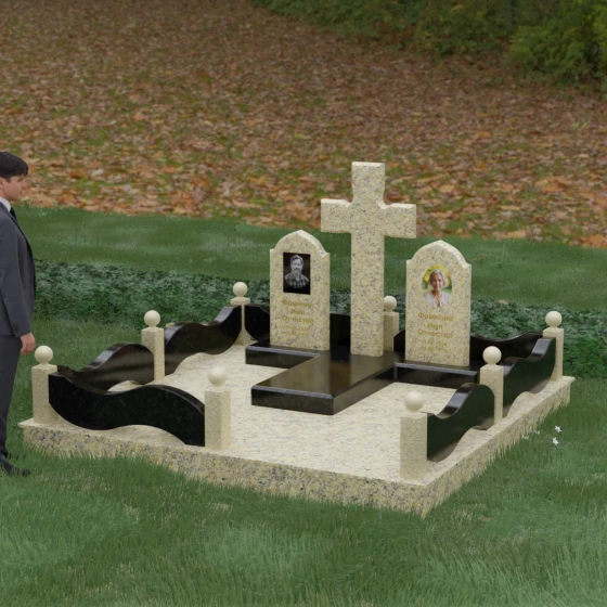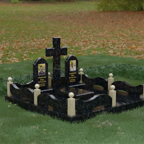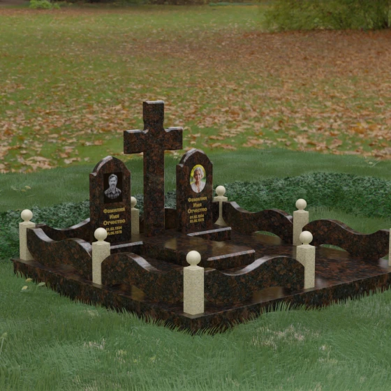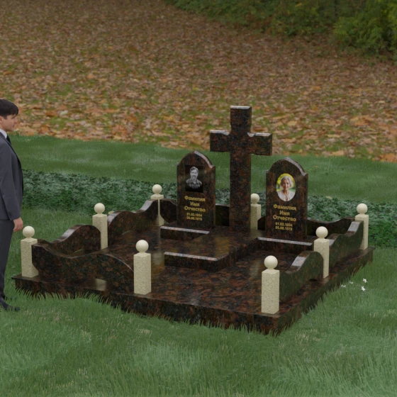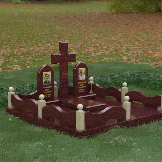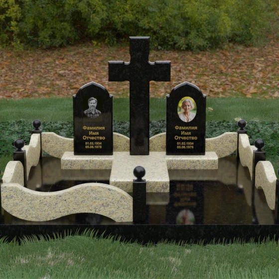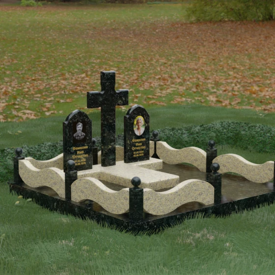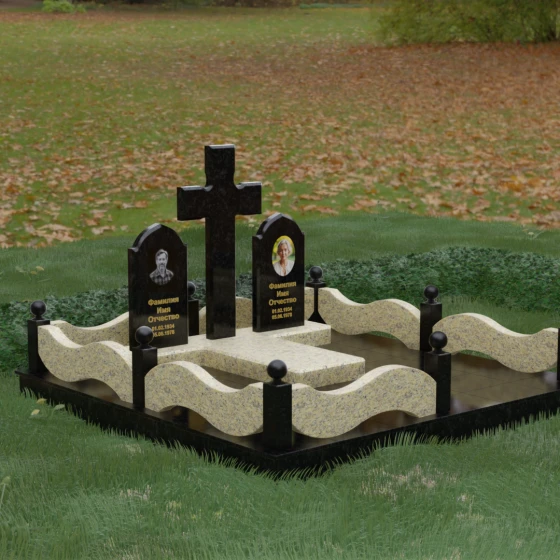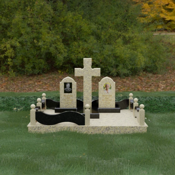 Выбор места памяти для двоих близких людей — это всегда поиск гармонии между монументальностью и глубоким духовным смыслом. Данный гранитный монумент представляет собой величественный мемориальный ансамбль, в центре которого возвышается массивный православный крест. Его строгая геометрия с характерными ступенчатыми выступами на перекладинах придает композиции архитектурную завершенность и сакральную значимость. По обе стороны от символа веры расположены парные памятные плиты с изящными арочными вершинами, напоминающими купола храмов. Такая форма олицетворяет небесный свод и покой, создавая атмосферу умиротворения и вечной памяти.