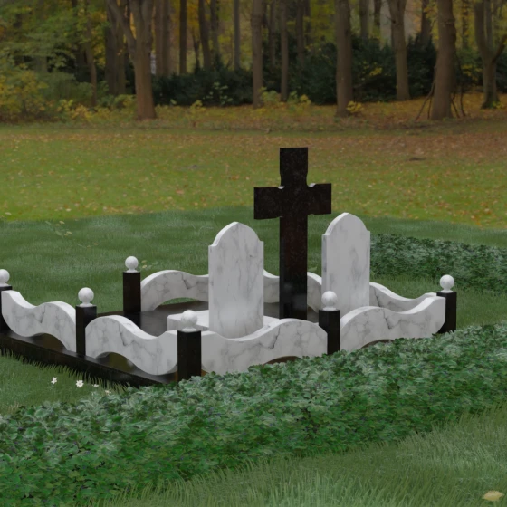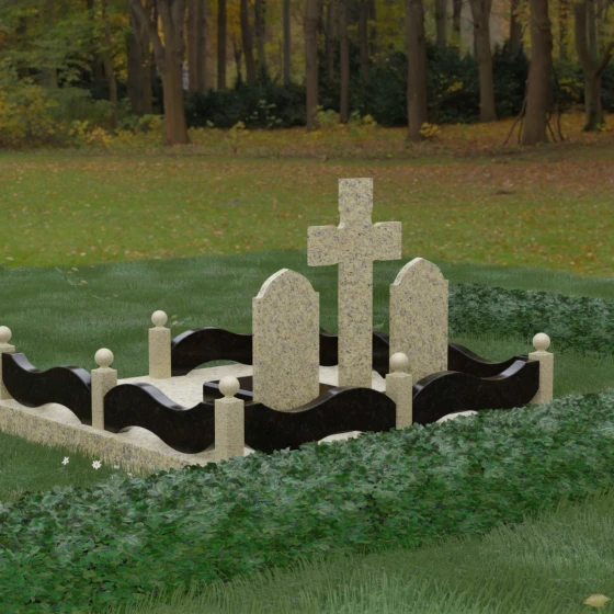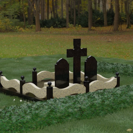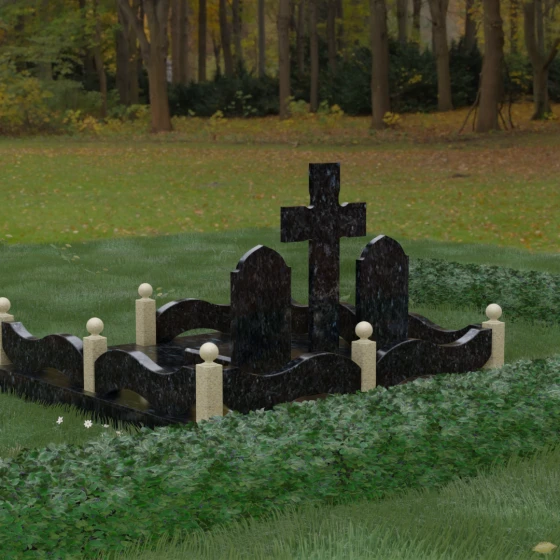 Эстетическая ценность этой модели заключается в безупречной игре контрастов. Глубокая зеркальная полировка темного камня эффектно подчеркивает светлые элементы благоустройства. Особое внимание привлекает ограждение участка: волнообразные резные панели из светлого гранита соединяют массивные столбики, увенчанные идеально отшлифованными каменными шарами. Это не просто памятник, а полноценный архитектурный комплекс, который выделяется на фоне стандартных решений своей статью и продуманностью каждой детали — от радиуса изгиба фасок до симметрии расположения всех элементов.