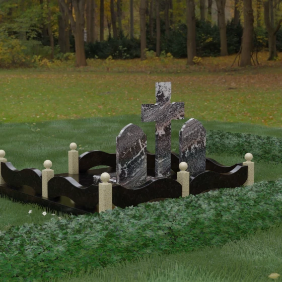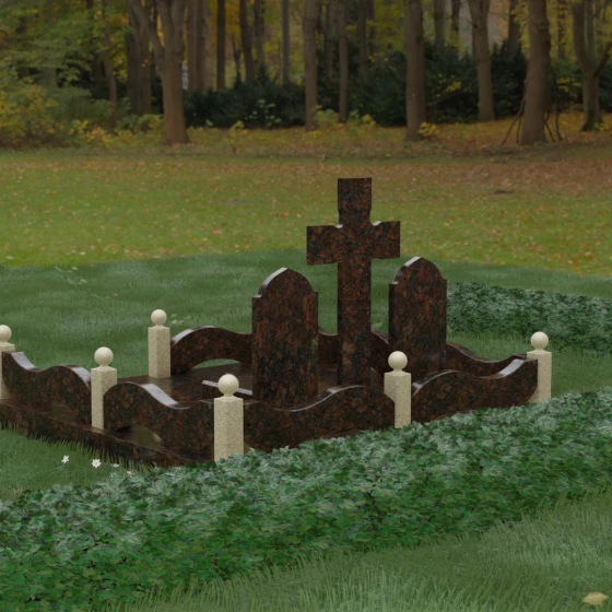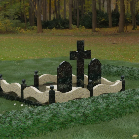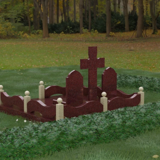 Важной особенностью модели является полное благоустройство участка. Мощение массивными гранитными плитами не только придает захоронению законченный и благородный вид, но и несет практическую пользу. Сплошное покрытие исключает прорастание сорной травы и скопление грязи, значительно упрощая уход за местом памяти. Высокий каменный цоколь по периметру служит надежным фундаментом, предотвращая усадку грунта и сохраняя идеальную геометрию всей конструкции на долгие годы. Это инвестиция в достойное оформление семейного захоронения, которое не потребует реставрации через десятилетия.