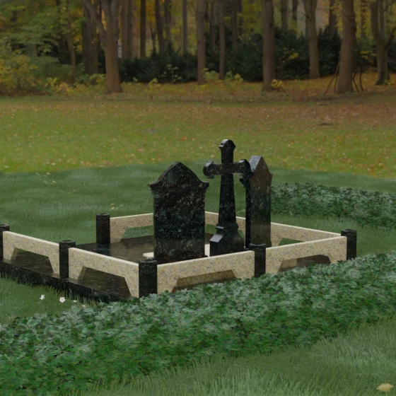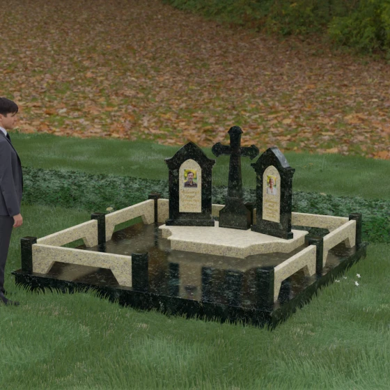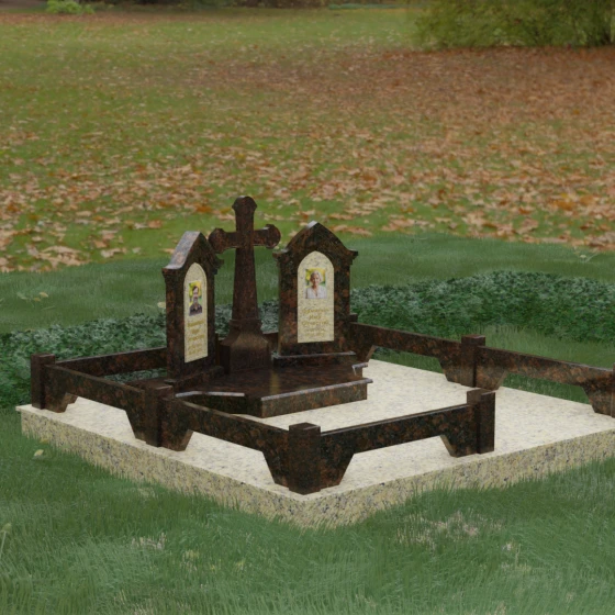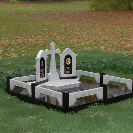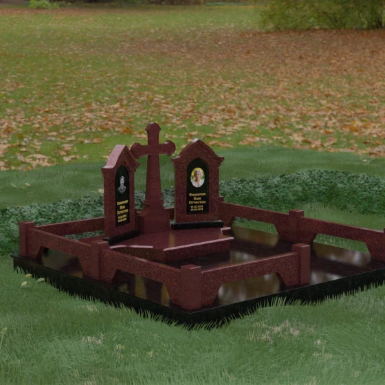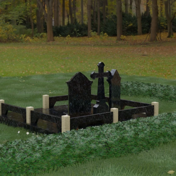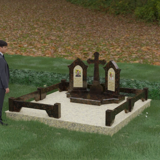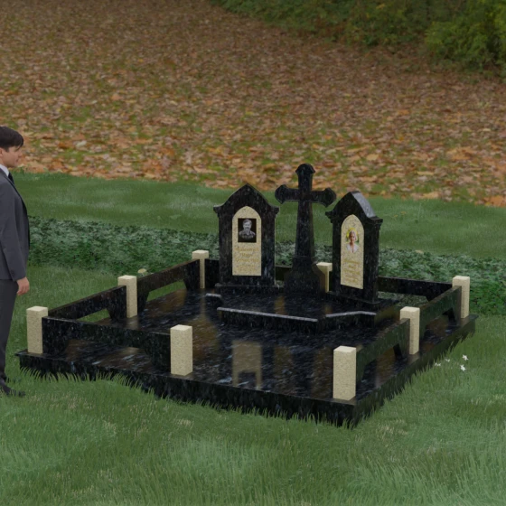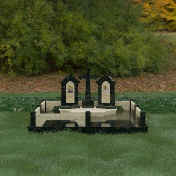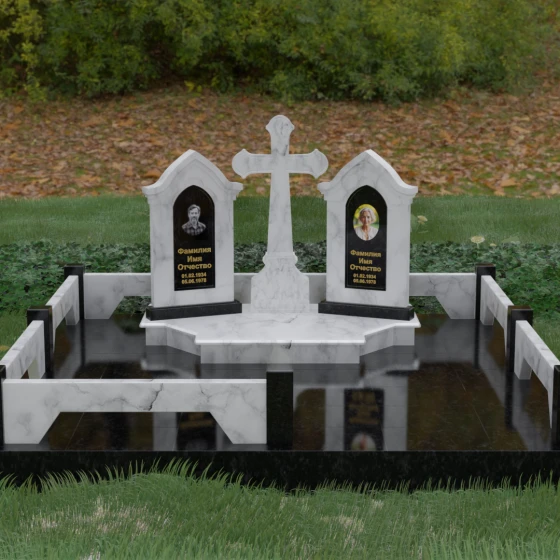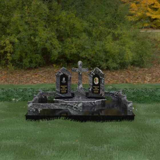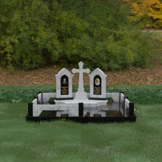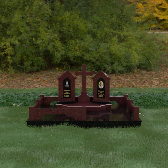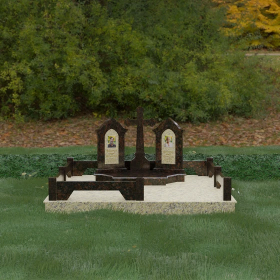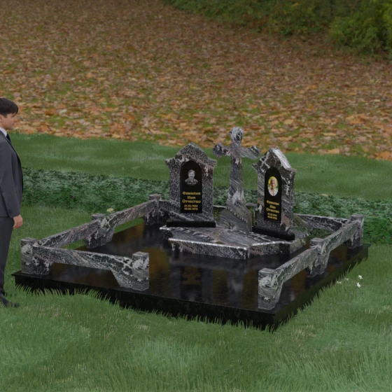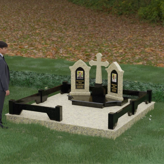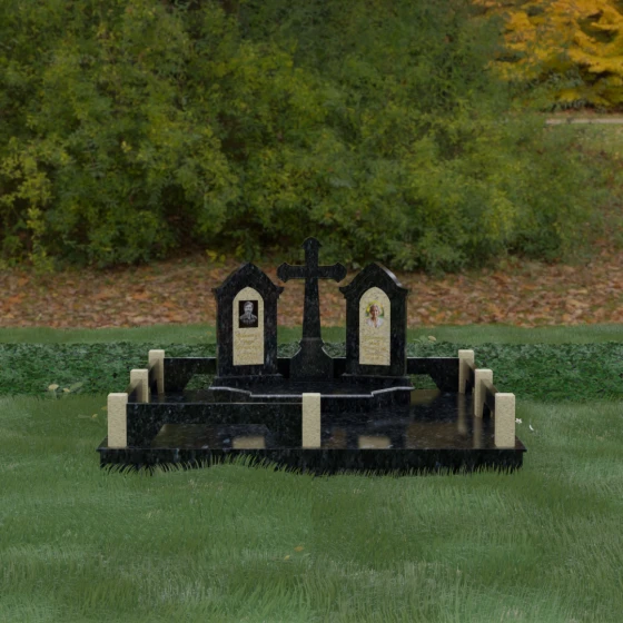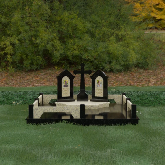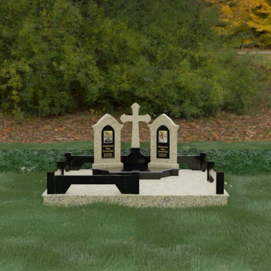 Центральным элементом ансамбля является величественный православный крест, установленный на массивном многоступенчатом постаменте. Его строгие, но изящные линии символизируют духовную опору и веру. По обе стороны от креста расположены две симметричные стелы, выполненные в форме изящных арок. Особенностью данной модели является виртуозная игра контрастов: основные корпуса стел изготовлены из темного, глубоко отполированного камня, в который инкрустированы светлые вставки из натурального гранита. Эти светлые «окна» служат идеальным фоном для портретов и памятных надписей, делая их визуально более легкими и возвышенными.