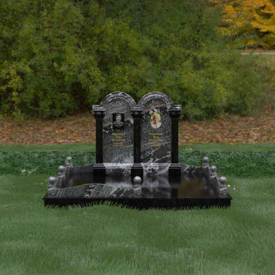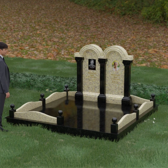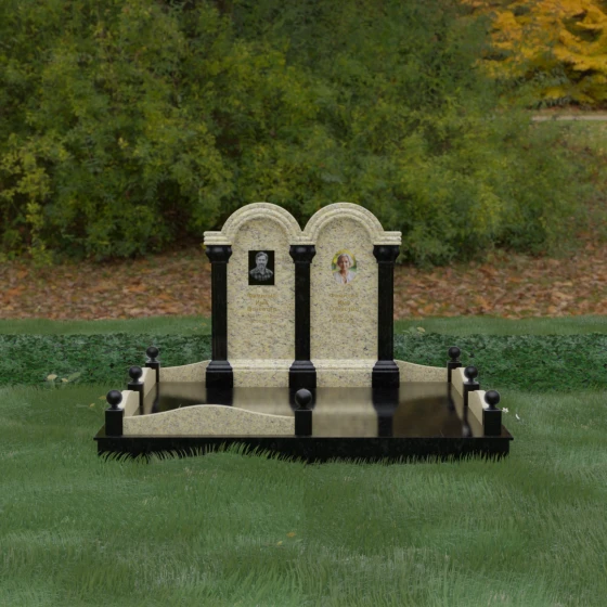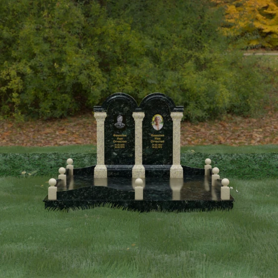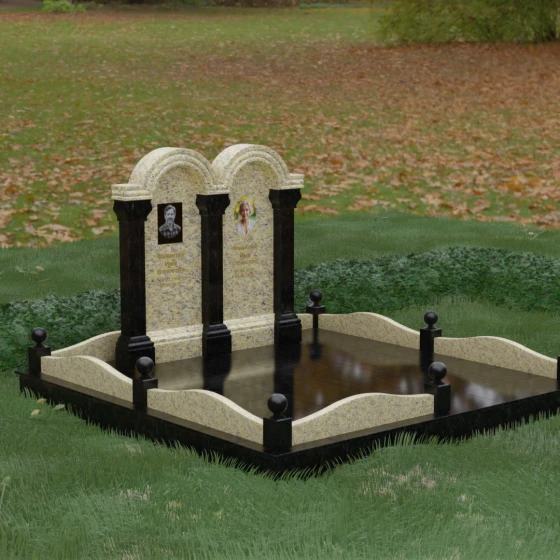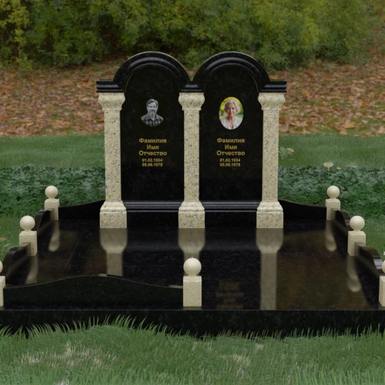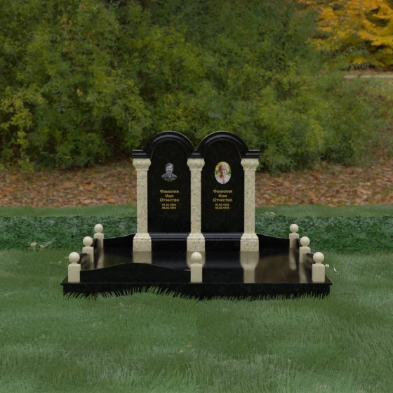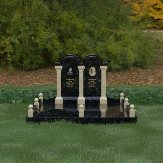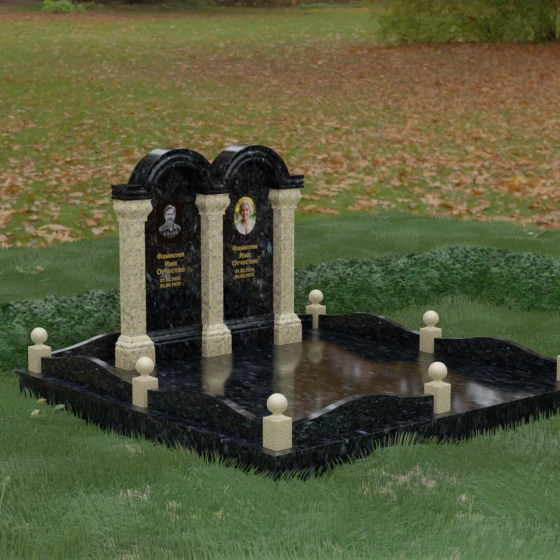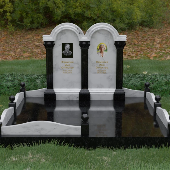 Центральная композиция мемориала решена в форме двойной величественной арки, что символизирует неразрывную духовную связь и вечное единство душ. Основные вертикальные полотна выполнены из глубокого черного камня с зеркальной полировкой, на котором гравировка портретов и золоченые буквы выглядят особенно торжественно. Эти плиты обрамлены тремя массивными колоннами из контрастного светлого гранита с мелкозернистой фактурой. Колонны увенчаны декоративными капителями и поддерживают двойной арочный свод, создавая эффект портала в вечность. Игра контрастов — иссиня-черного глянца и матового тепла светлого камня — придает памятнику объем и многогранность, делая его доминантой мемориального ландшафта.