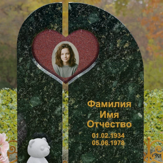 Особое внимание в данной модели уделено интеграции портрета. Ниша в форме сердца, расположенная в левой части композиции, является идеальным обрамлением для керамического фото или гравировки. Такое расположение акцентирует внимание на образе близкого человека, защищая его визуально «внутри» камня. Правая часть обелиска предназначена для лаконичного нанесения имени и дат, которые могут быть выполнены сусальным золотом или глубокой пескоструйной гравировкой, что идеально контрастирует с полированной поверхностью.