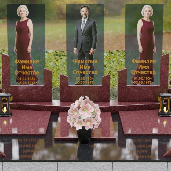 Оформление: Для стел такой формы идеальным решением станет классическая глубокая гравировка с покрытием сусальным золотом. Высокие вертикальные плоскости позволяют расположить портреты в полный рост или крупные погрудные изображения, сохраняя при этом достаточно места для эпитафий и декоративных символов. Золочение букв будет эффектно контрастировать с темными видами гранита, подчеркивая статус и торжественность мемориала.