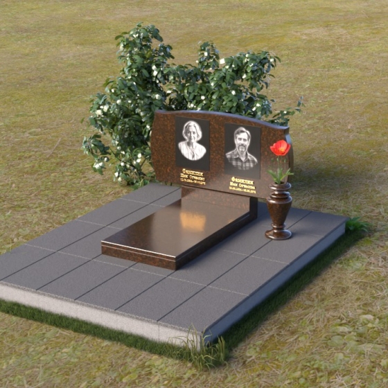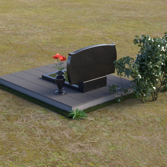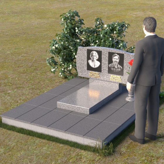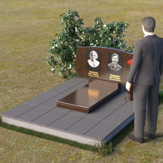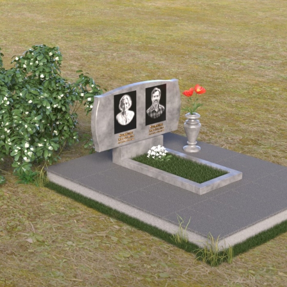 Величественная стела ПГ124 представляет собой гармоничное сочетание строгих линий и плавных изгибов. Верхняя часть памятника имеет волнообразную форму, словно повторяя контуры облаков или мягкие складки ткани. Два плавных выступа образуют своеобразные "плечи", обрамляющие портреты усопших. Края стелы деликатно скруглены, смягчая строгость камня и придавая ему благородный вид. Нижняя часть стелы переходит в прямоугольную опору, формируя устойчивое основание. Фаски по периметру добавляют визуальную легкость, подчеркивая геометрию формы. Небольшая горизонтальная плита с зеркальной полировкой, расположенная перед стелой, словно отражает небеса, создавая ощущение связи с вечностью.