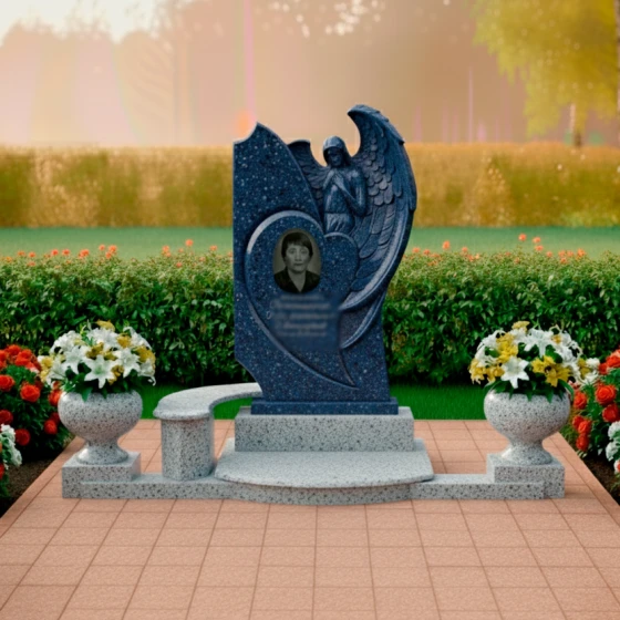 Особое внимание привлекает мастерски выполненная резьба. В верхней части стелы, словно вырастая из самого камня, мы видим объемную фигуру ангела. Его крылья, с тщательно проработанными перьями, кажутся легкими и воздушными, несмотря на твердость камня. Лик ангела обращен вверх, выражая покой и надежду, а его руки сложены в молитвенном жесте. Эта деталь несет в себе мощный символизм, предлагая утешение и напоминание о духовной связи. В центре композиции, в обрамлении сердца, расположена ниша для портрета, которая словно погружается в камень, создавая эффект глубины и интимности. Надпись выполнена изящным шрифтом, подчеркивая торжественность момента. Все грани стелы тщательно обработаны, создавая ощущение завершенности и монументальности.
