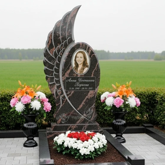 Кому подойдет: Этот мемориальный комплекс идеально подойдет для тех, кто ищет не просто памятник, а уникальное произведение искусства, способное глубоко и трогательно выразить светлую память о близком человеке. Его плавные, обтекаемые формы и символика крыла делают его особенно подходящим для увековечивания памяти о женщинах, чья жизнь была наполнена нежностью, грацией и духовностью. Мемориал станет достойным символом вечного покоя и возвышенной памяти, отражая индивидуальность и значимость ушедшего. Возможность выбора из 8 цветовых решений — 7 видов гранита (гранит амфиболит, гранит Балтик грин, гранит Блю Перл, гранит Габбро-диабаз, гранит Дымовский, гранит Лезниковский, гранит Мансуровский) и 1 вид мрамора (мрамор Тассо) — позволяет подобрать камень, который наиболее точно соответствует характеру и предпочтениям усопшего, создавая по-настоящему персонализированный и глубоко символичный мемориал.