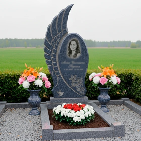 Центральным элементом комплекса является стела, выполненная в уникальной асимметричной форме, напоминающей распахнутое крыло ангела или взлетающую птицу, символизирующую вознесение души и безмятежный покой. Одна сторона стелы имеет строгую вертикальную линию, тогда как другая плавно изгибается вверх, создавая ощущение легкости и устремленности. Эта динамичная форма, лишенная острых углов, передает идею непрерывности жизненного пути и перехода в иное измерение. Грани стелы тщательно отполированы, что придает камню зеркальный блеск и глубину, в то время как внутренняя часть "крыла" украшена объемной резьбой, имитирующей перья. Эта резьба создает игру света и тени, подчеркивая естественную фактуру камня и придавая композиции дополнительный объем и выразительность. На лицевой стороне стелы, в верхней части, выгравирован овальный портрет, обрамленный тонкими линиями, а ниже — информация о покойном, выполненная изящным шрифтом. В нижней части стелы расположена гравировка двух летящих голубей — вечного символа мира, чистоты души и небесного покоя, что еще больше усиливает эмоциональное воздействие мемориала.