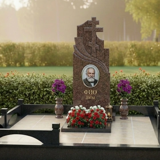 Особое внимание уделено благоустройству прилегающего участка, которое создает единый, гармоничный ансамбль. Монумент установлен на высокий, прочный гранитный цоколь, формирующий четкий периметр участка. Цоколь выполнен из того же камня, что и стела, но с легкой, едва заметной шероховатостью, что придает ему дополнительную устойчивость и монументальность. Надгробная плита, полностью покрывающая участок, выполнена в единой цветовой гамме и фактуре с цоколем, создавая законченный и ухоженный вид. Это решение не только придает композиции целостность, но и значительно упрощает уход за местом захоронения, избавляя от необходимости прополки и поддержания чистоты. По углам цоколя расположены массивные, но элегантные гранитные столбики, которые завершают ограждение, придавая ему благородный и торжественный вид. В центре надгробной плиты, напротив стелы, предусмотрено место для высадки цветов или установки декоративных элементов, что позволяет добавить индивидуальности и живых красок в композицию. По бокам от центральной части расположены две изящные гранитные вазы, предназначенные для свежих цветов, которые привносят в строгий облик монумента нотки нежности и жизни.