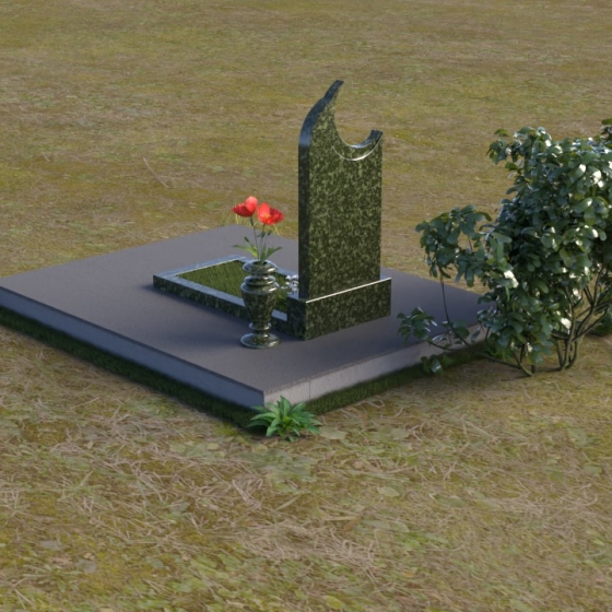 Этот гранитный монумент притягивает взгляд своей необычной формой. Основной элемент – вертикальная плита, увенчанная плавной, асимметричной дугой, напоминающей полумесяц. Её левая сторона чуть выше правой, что создает ощущение динамики и незавершенности, словно оборвавшейся жизни. Поверхность лицевой стороны отполирована до зеркального блеска, отражая небо и окружающий пейзаж, создавая иллюзию глубины и пространства. На полированной поверхности выгравирован портрет усопшего, надпись с именем и датами жизни. Нижняя часть монумента, сопрягаясь с горизонтальной плитой, образует единый ансамбль. Переход между вертикальной и горизонтальной плоскостями подчеркнут небольшой ступенькой, добавляющей конструкции объема. Горизонтальная плита, в свою очередь, также отполирована до блеска, отражая свет и усиливая эффект монументальности. Фаски на гранях плиты аккуратно обработаны, что придает памятнику завершенный и элегантный вид. Сбоку от монумента расположена небольшая гранитная ваза, предназначенная для живых цветов, которые станут символом вечной памяти и любви.